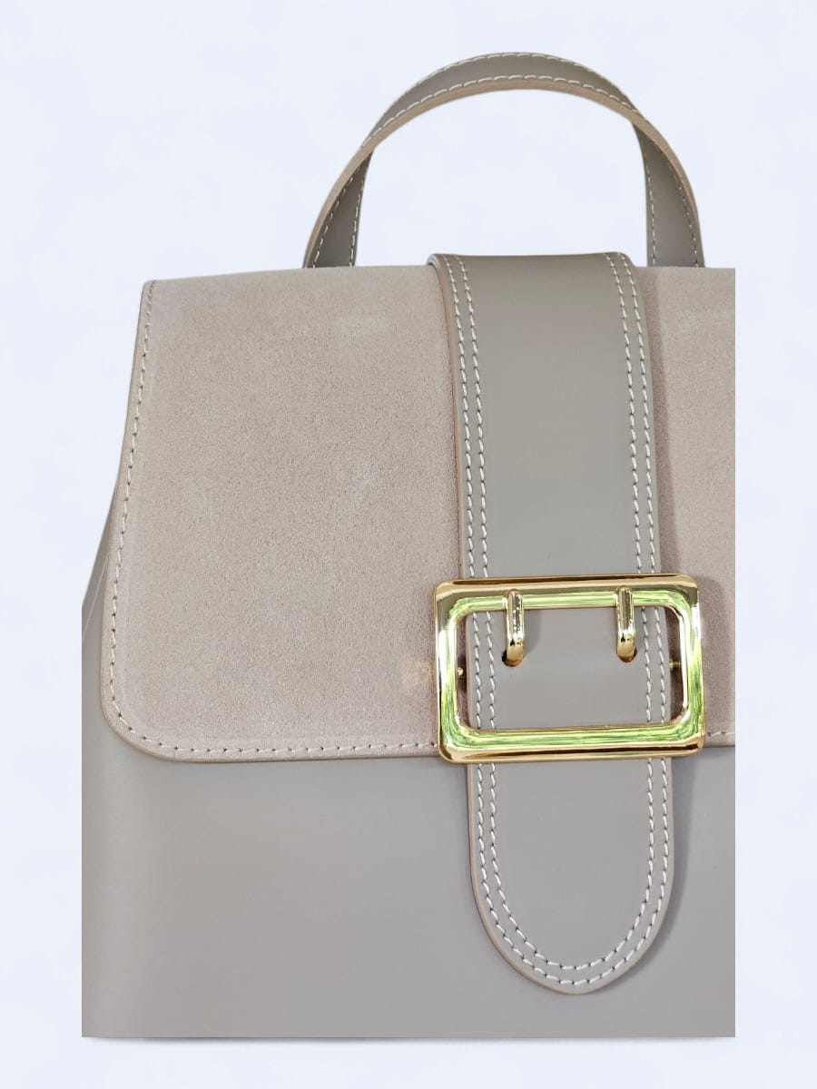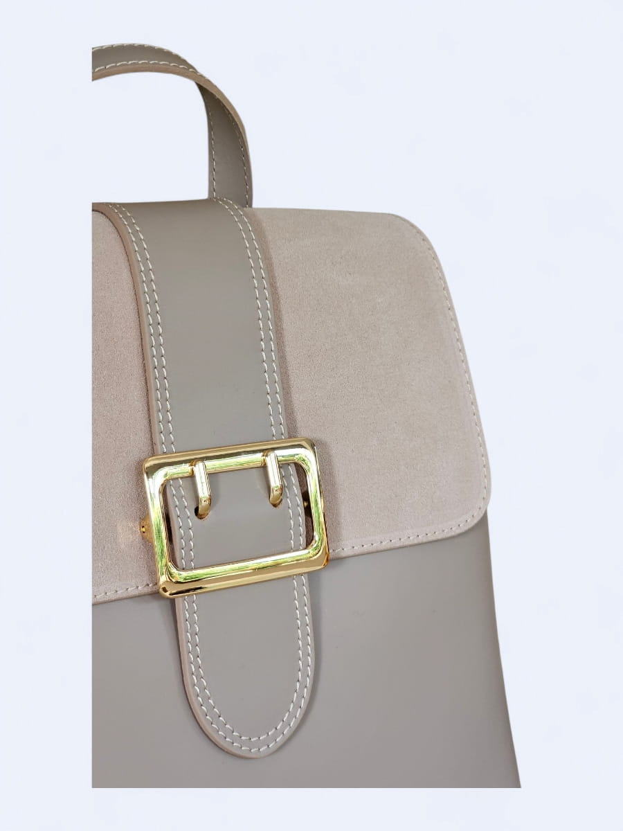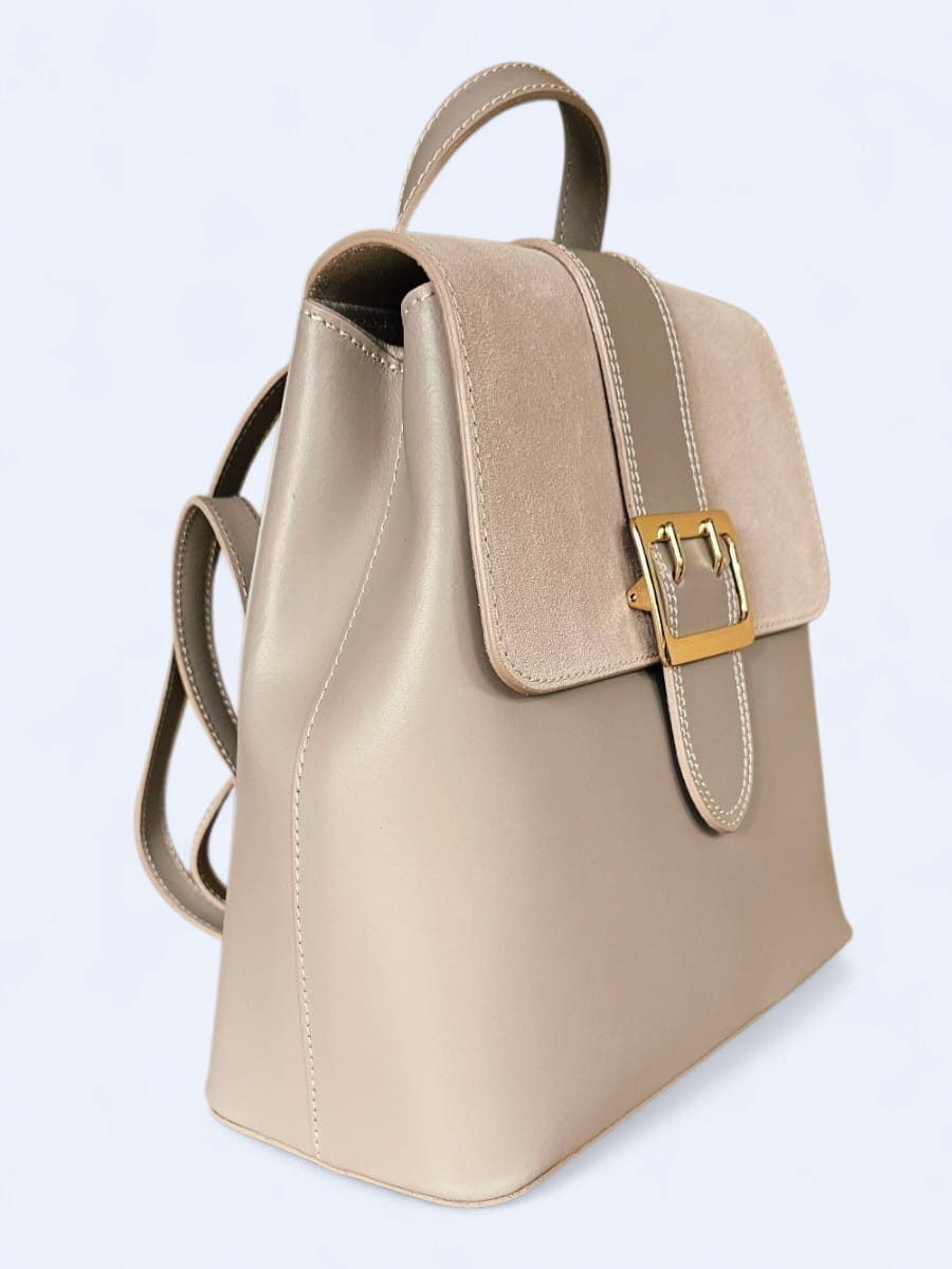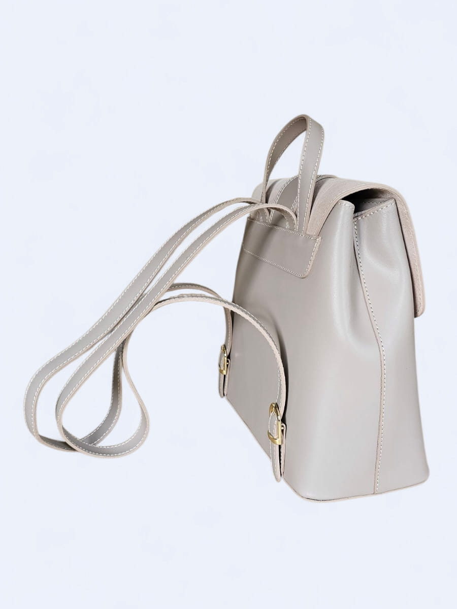 Ten wyjątkowy plecak to połączenie ponadczasowej elegancji i nowoczesnego minimalizmu, zaprojektowany z myślą o kobietach, które cenią sobie klasę i funkcjonalność. Wykonany z najwyższej jakości naturalnej skóry licowej oraz miękkiego, szlachetnego zamszu, zachwyca subtelnym zestawieniem faktur i kolorów. Gładkie, lekko połyskujące powierzchnie skóry pięknie kontrastują z matowym wykończeniem klapy, nadając całości wyrafinowanego charakteru.