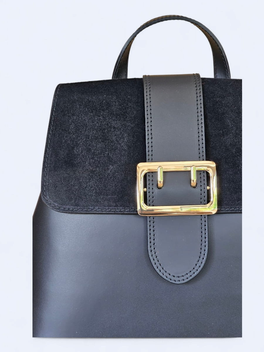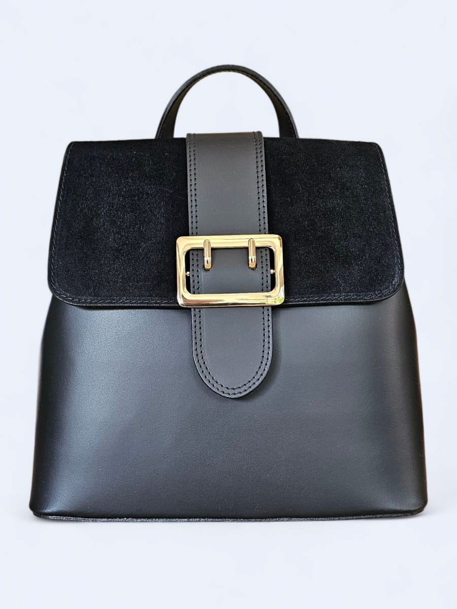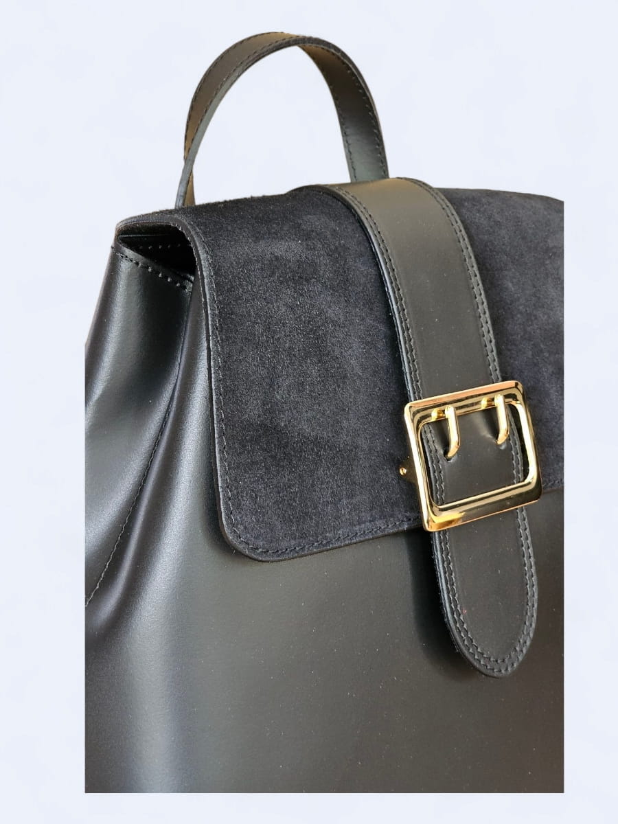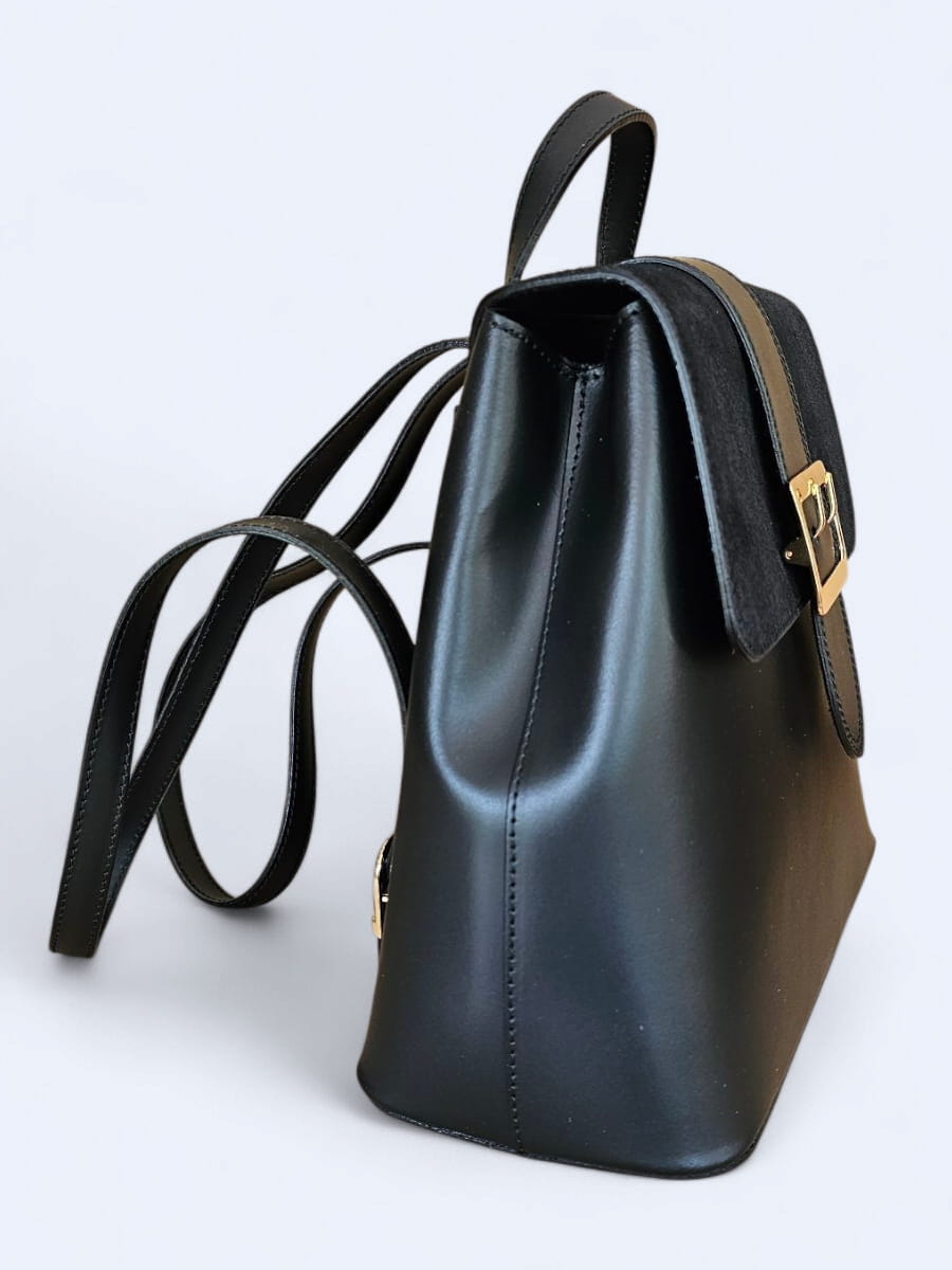 Front plecaka zdobi szeroki pasek z ozdobną złotą klamrą, która stanowi nie tylko element dekoracyjny, ale również podkreśla luksusowy styl akcesorium. Zamknięcie na magnetyczny zatrzask ukryty pod klapą zapewnia szybki i wygodny dostęp do wnętrza, a jednocześnie zachowuje estetyczną czystość formy.