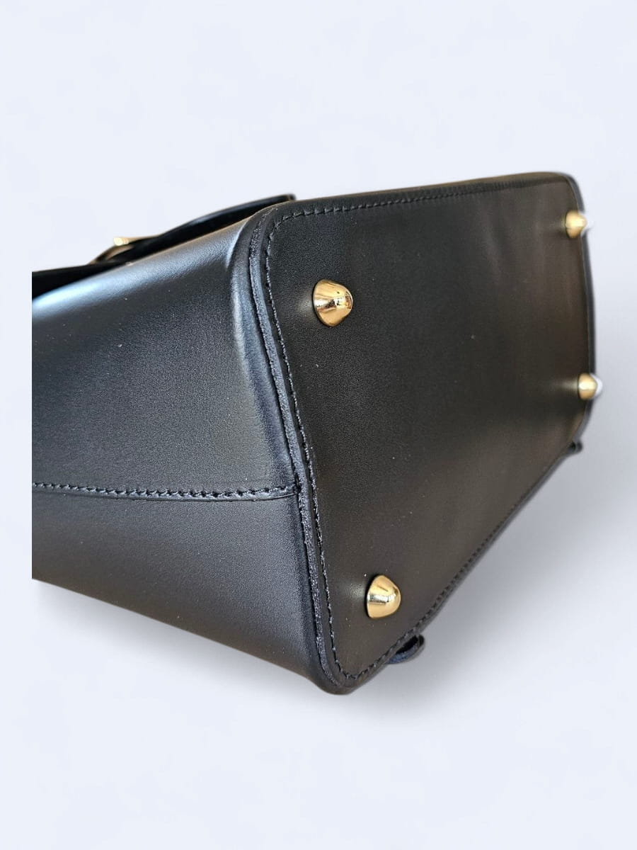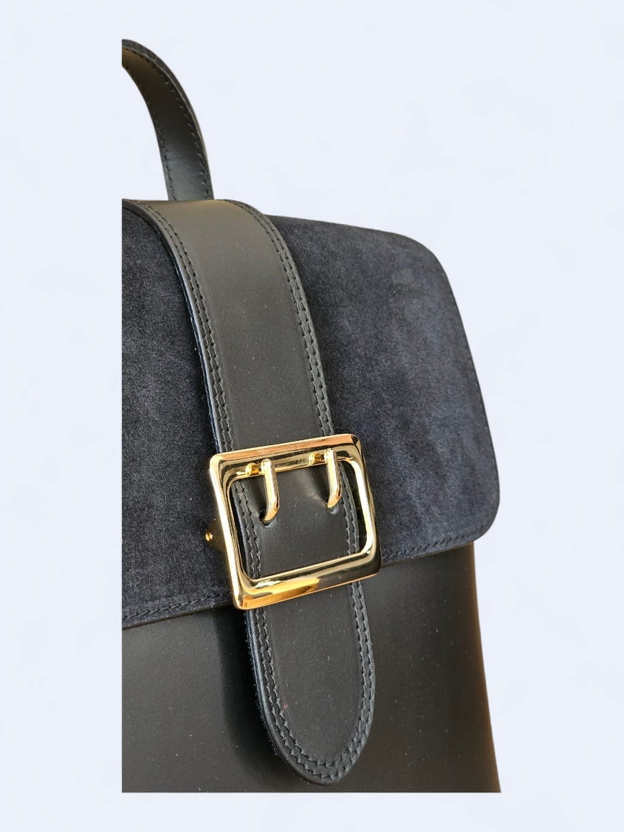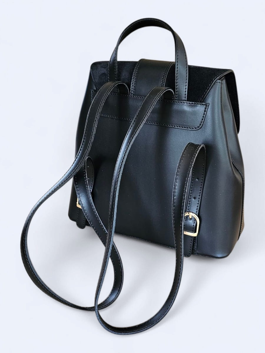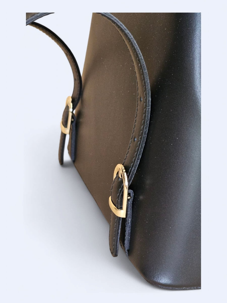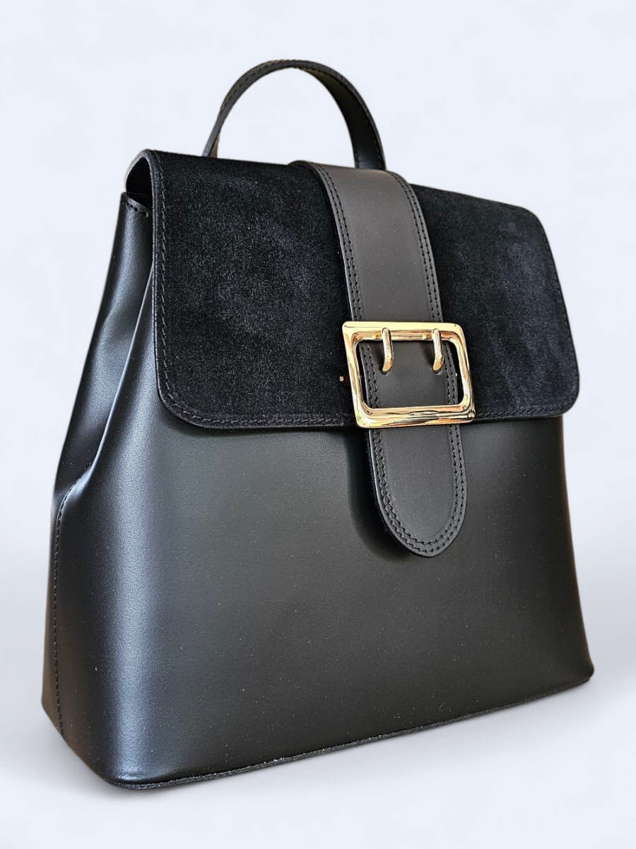 Front plecaka zdobi szeroki pasek z ozdobną złotą klamrą, która stanowi nie tylko element dekoracyjny, ale również podkreśla luksusowy styl akcesorium. Zamknięcie na magnetyczny zatrzask ukryty pod klapą zapewnia szybki i wygodny dostęp do wnętrza, a jednocześnie zachowuje estetyczną czystość formy.