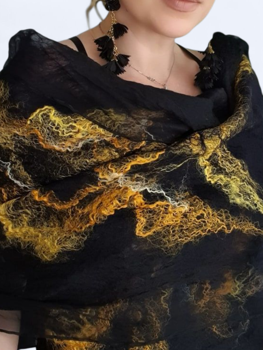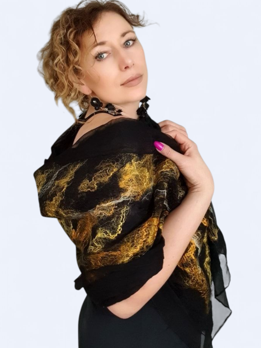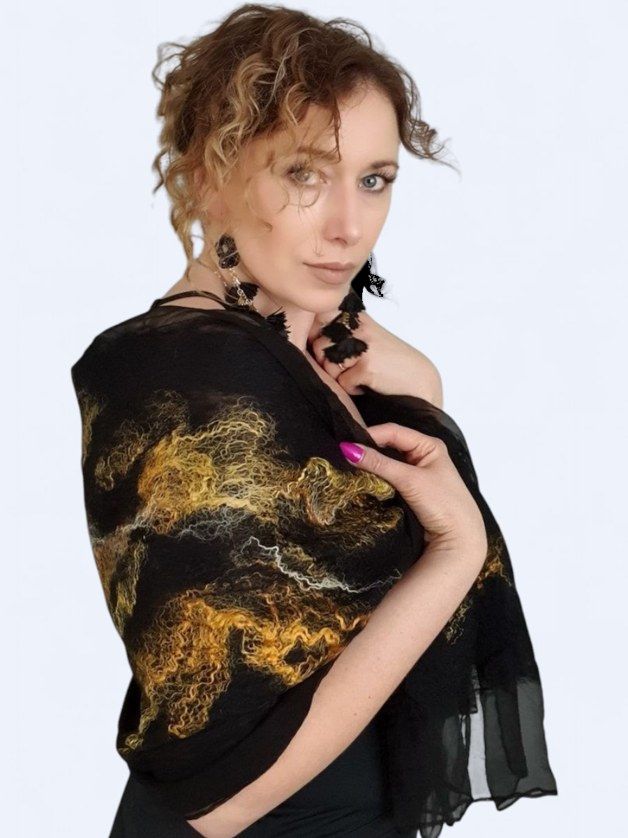 Ręcznie filcowany szal wykonany z szyfonu jedwabnego oraz delikatnej wełny z merynosów australijskich. Piękny i unikalny. Ozdobiony jedwabnymi włóknami. Zwiewny, lekki, delikatny i niegryzący. Można nosić go niedbale owiniętym wokół szyi jak i zarzuconym na ramiona. Szal filcowany na szyfonie jedwabnym.