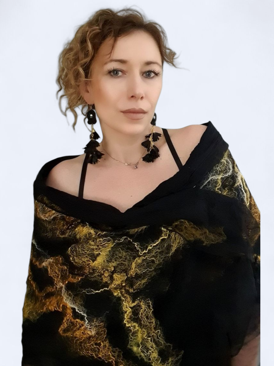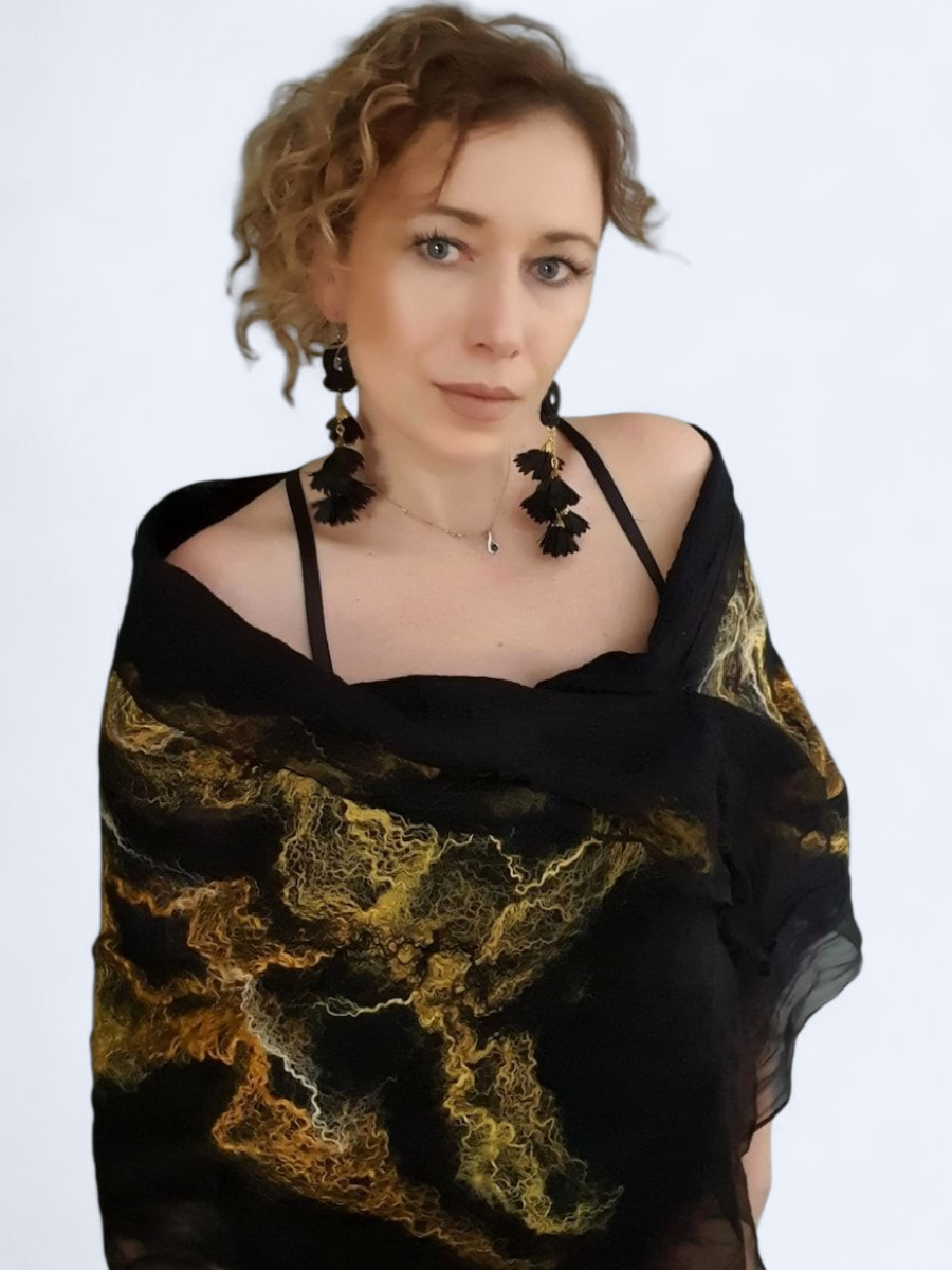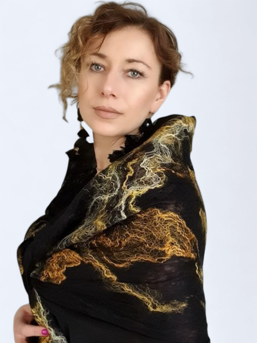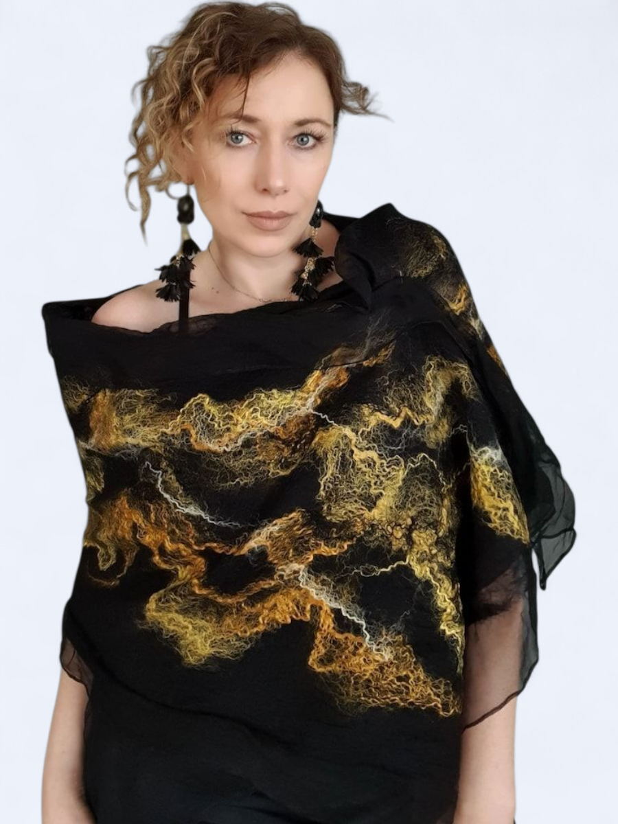 Ręcznie filcowany szal wykonany z szyfonu jedwabnego oraz delikatnej wełny z merynosów australijskich. Piękny i unikalny. Ozdobiony jedwabnymi włóknami. Zwiewny, lekki, delikatny i niegryzący. Można nosić go niedbale owiniętym wokół szyi jak i zarzuconym na ramiona. Szal filcowany na szyfonie jedwabnym.