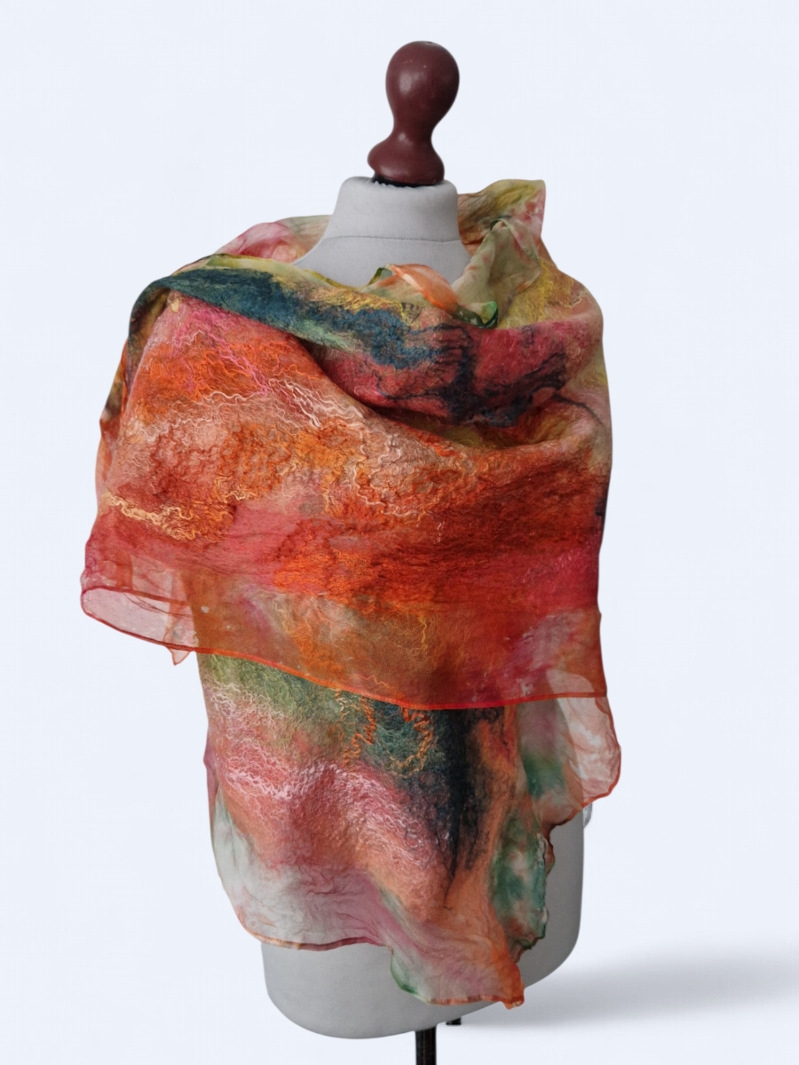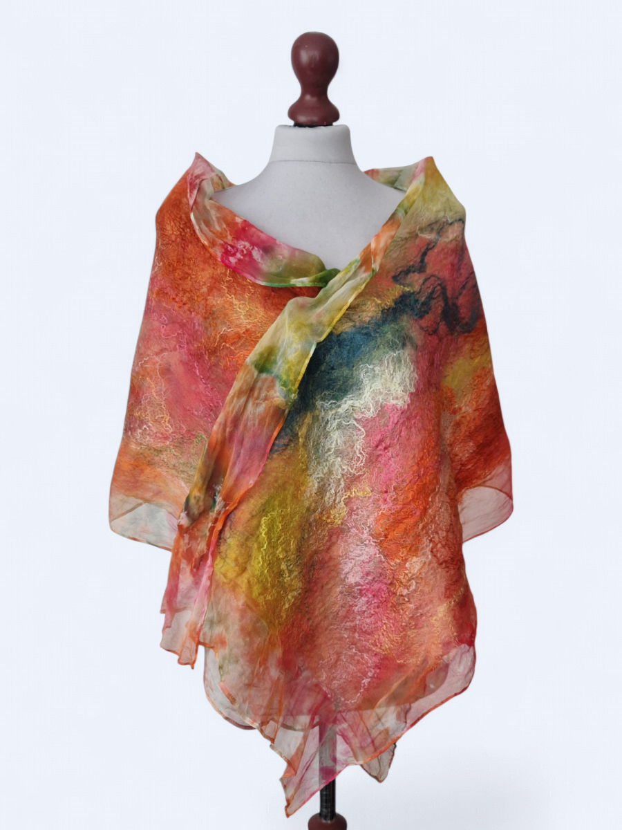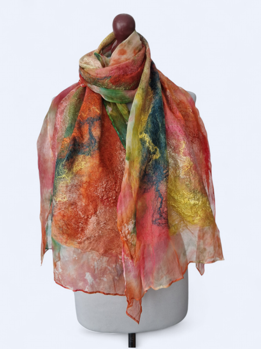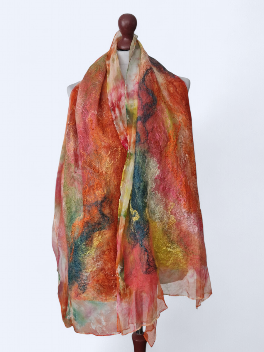 Ręcznie filcowany szal wykonany z szyfonu jedwabnego oraz delikatnej wełny z merynosów australijskich. Piękny i unikalny. Ozdobiony jedwabnymi włóknami. Zwiewny, lekki, delikatny i niegryzący. Można nosić go niedbale owiniętym wokół szyi jak i zarzuconym na ramiona. Szal filcowany na szyfonie jedwabnym.