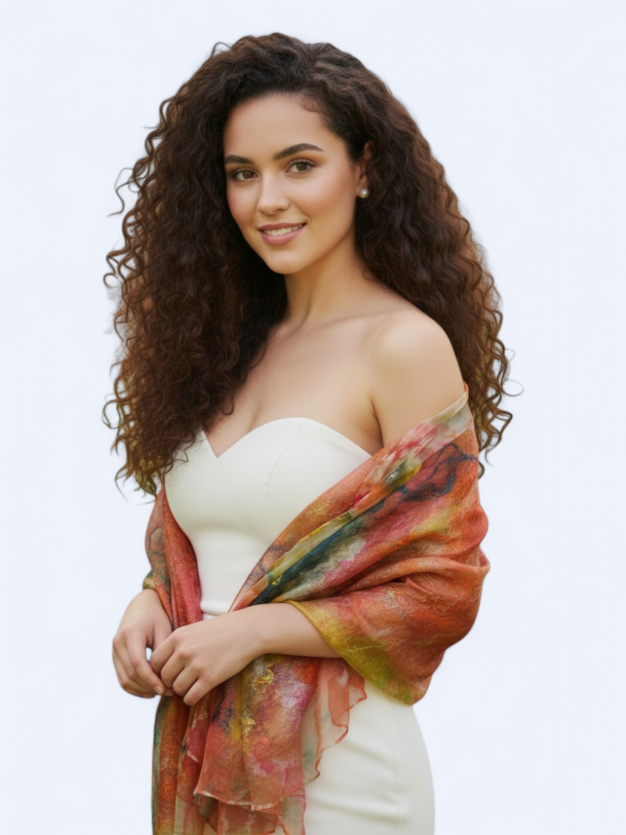 Szal jedwabno wełniany elegancki odcienie pomarańczu