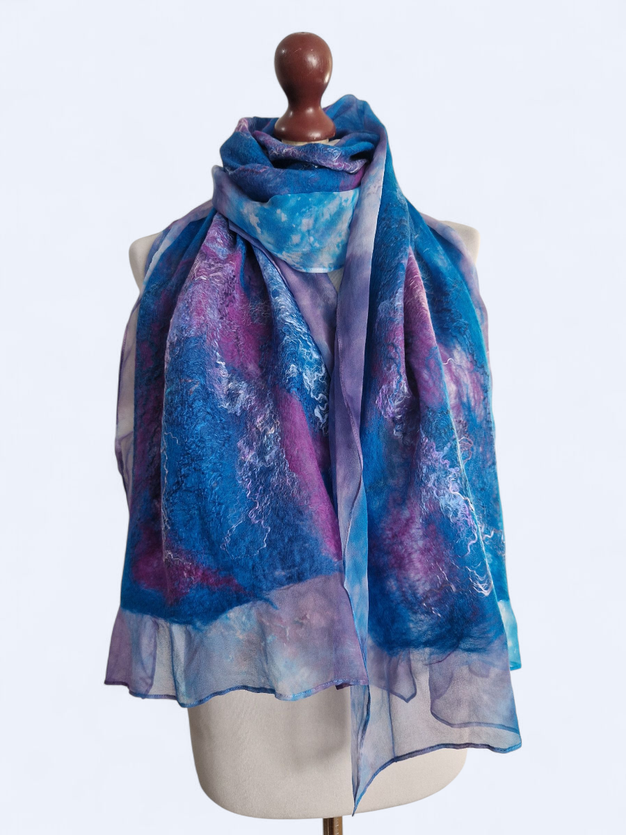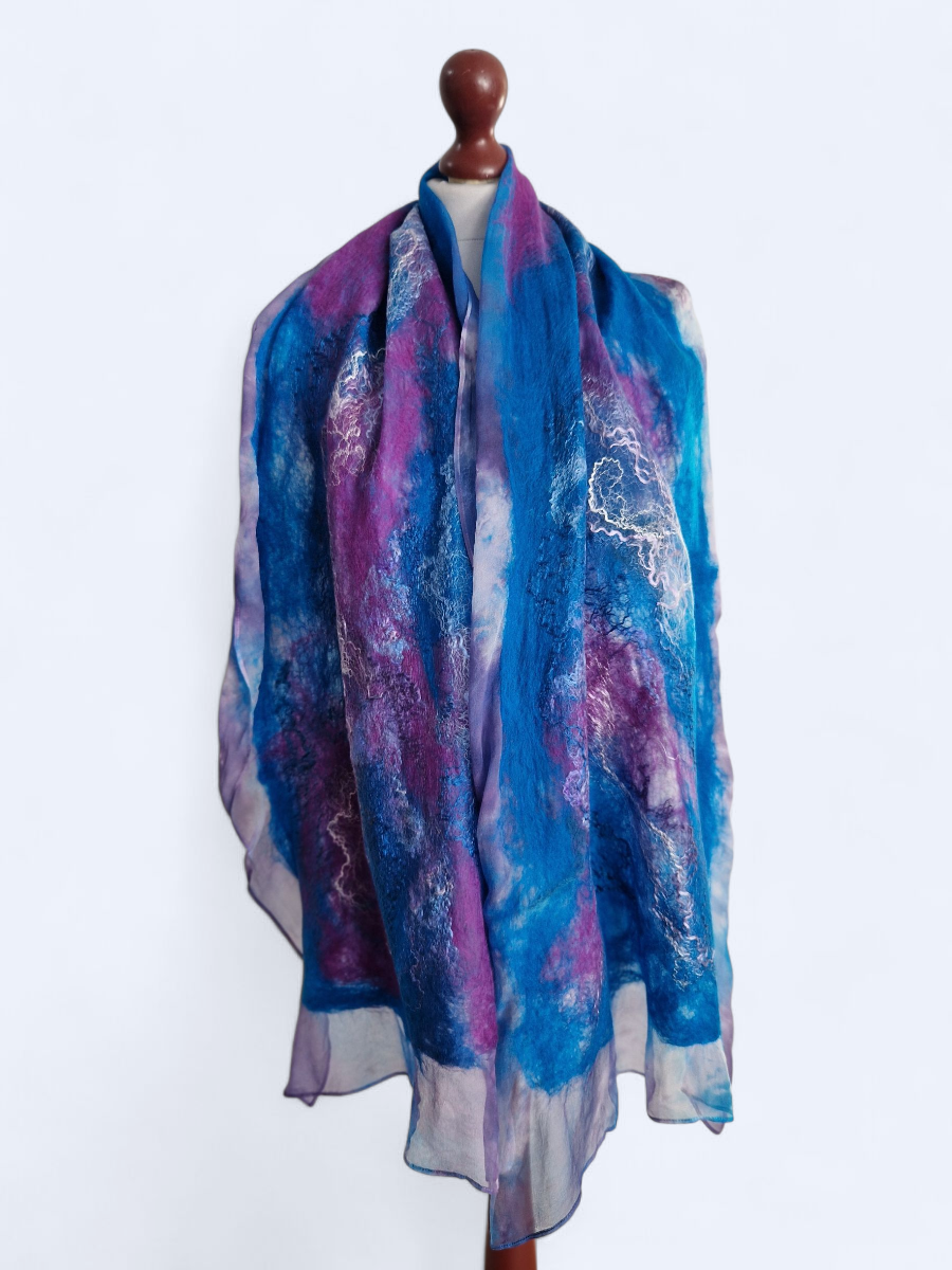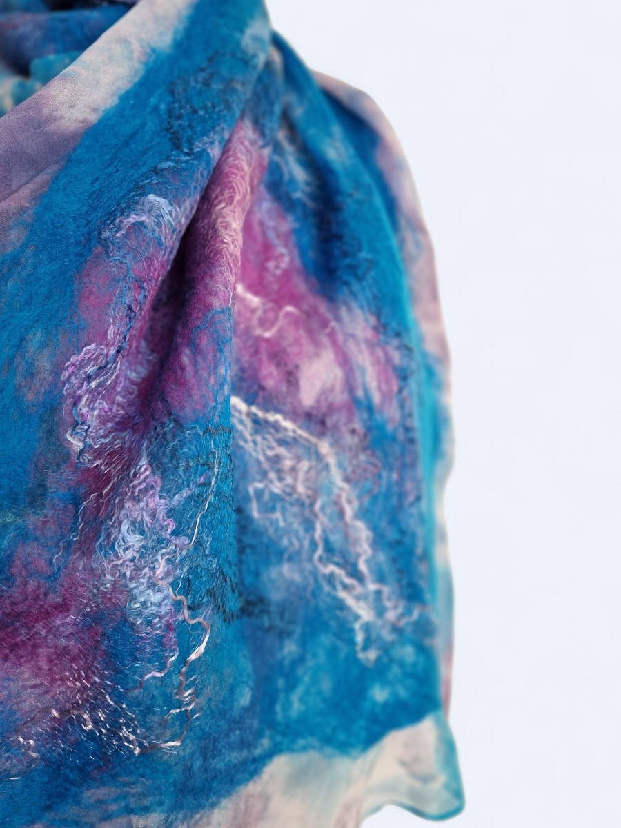 Ręcznie filcowany szal wykonany z szyfonu jedwabnego oraz delikatnej wełny z merynosów australijskich. Piękny i unikalny. Ozdobiony jedwabnymi włóknami. Zwiewny, lekki, delikatny i niegryzący. Można nosić go niedbale owiniętym wokół szyi jak i zarzuconym na ramiona. Szal filcowany na szyfonie jedwabnym.