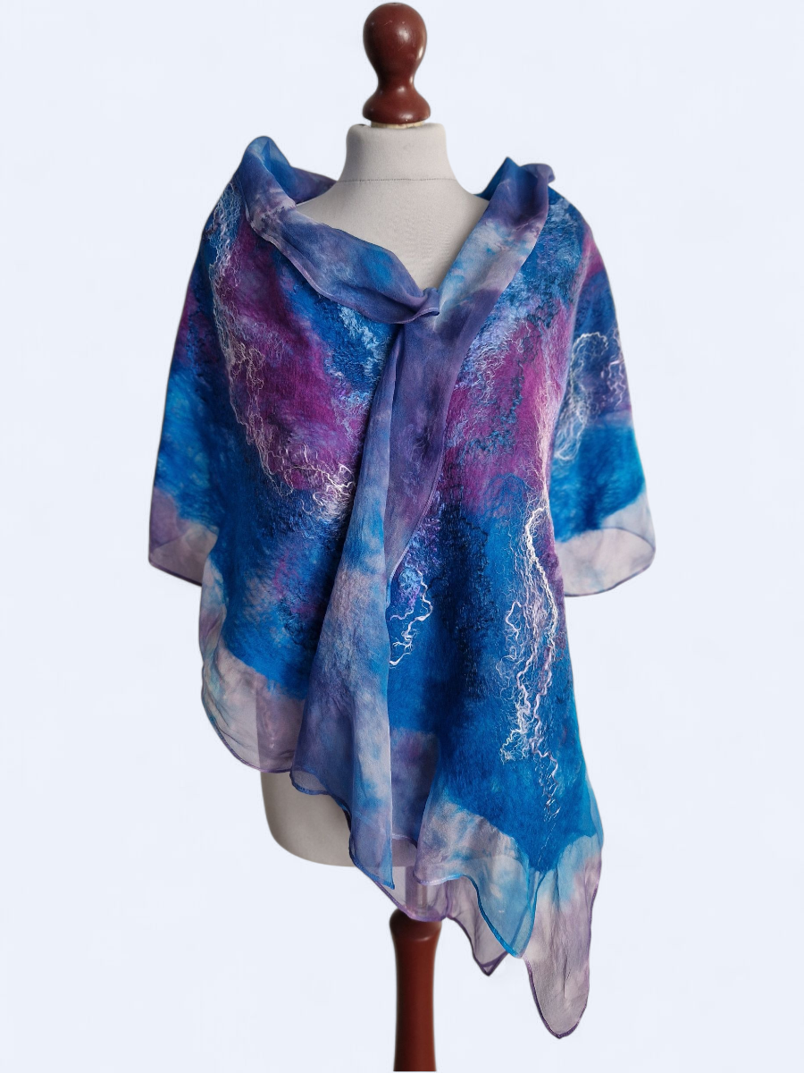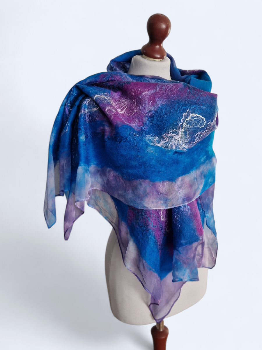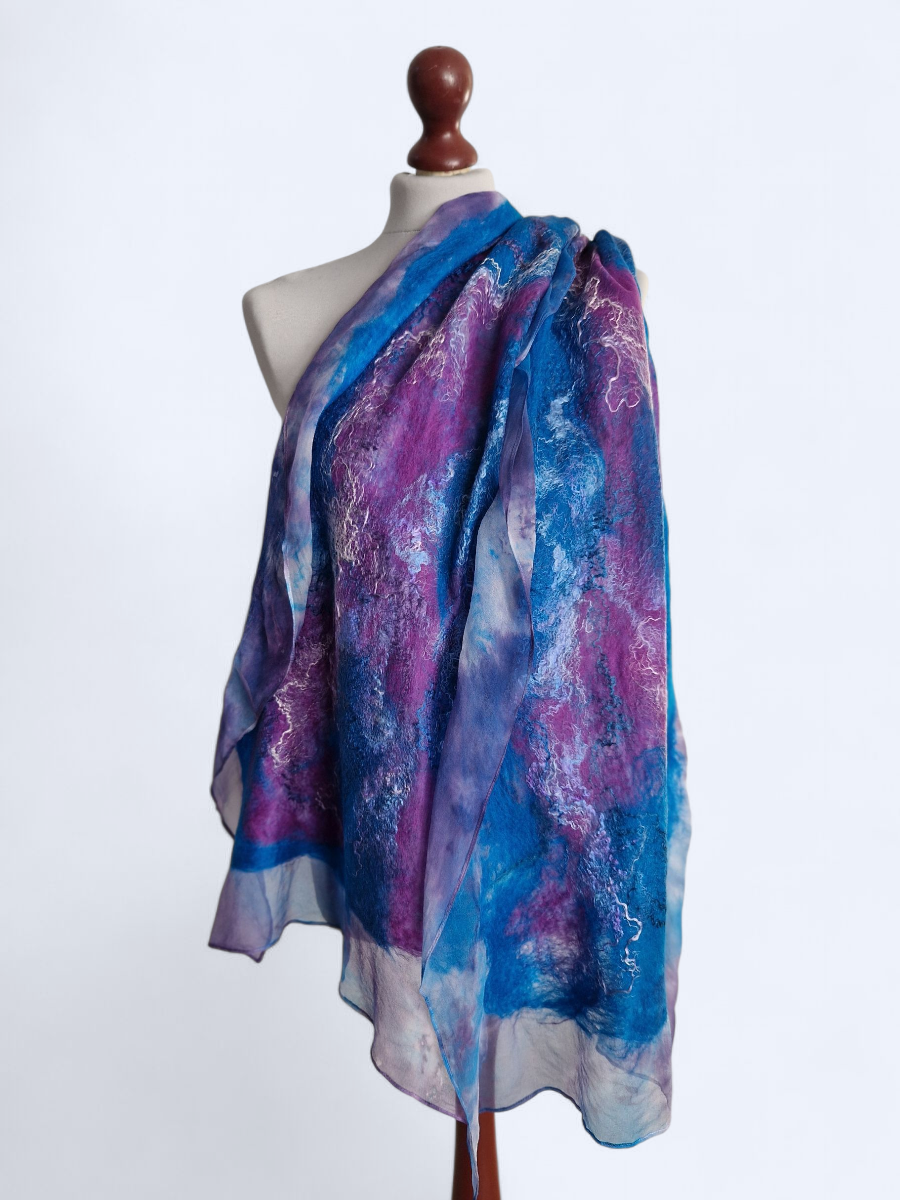 Ręcznie filcowany szal wykonany z szyfonu jedwabnego oraz delikatnej wełny z merynosów australijskich. Piękny i unikalny. Ozdobiony jedwabnymi włóknami. Zwiewny, lekki, delikatny i niegryzący. Można nosić go niedbale owiniętym wokół szyi jak i zarzuconym na ramiona. Szal filcowany na szyfonie jedwabnym.