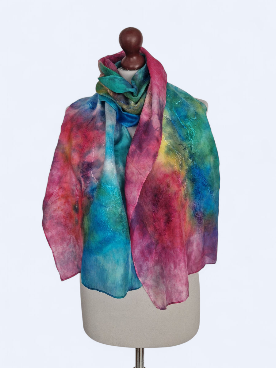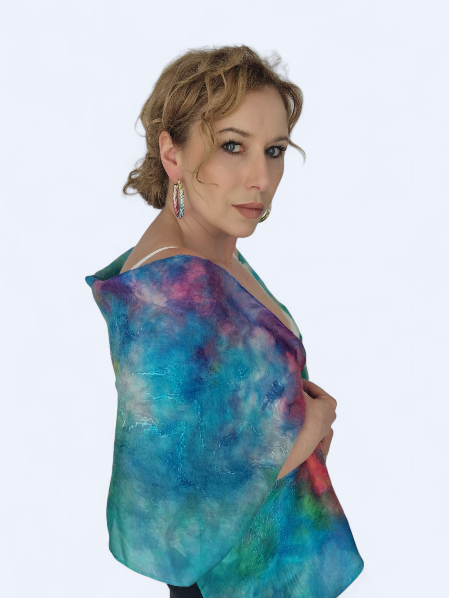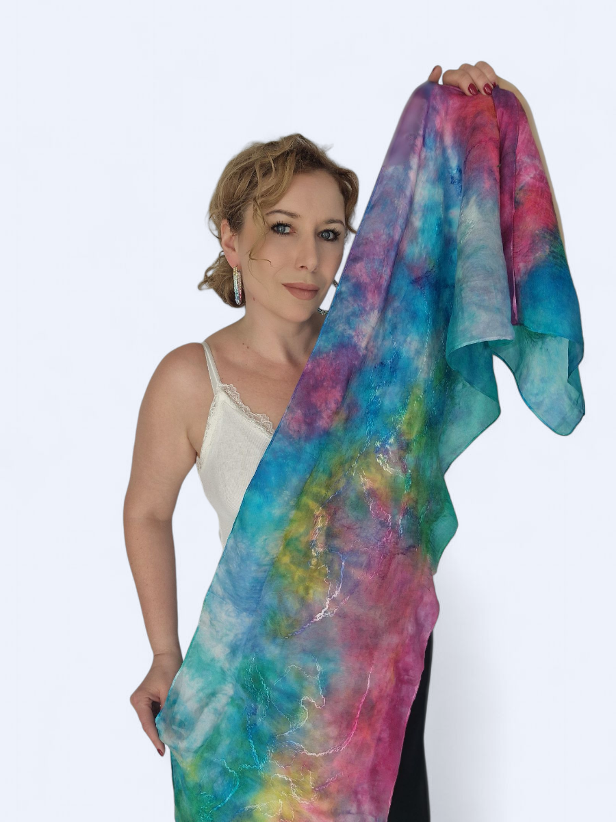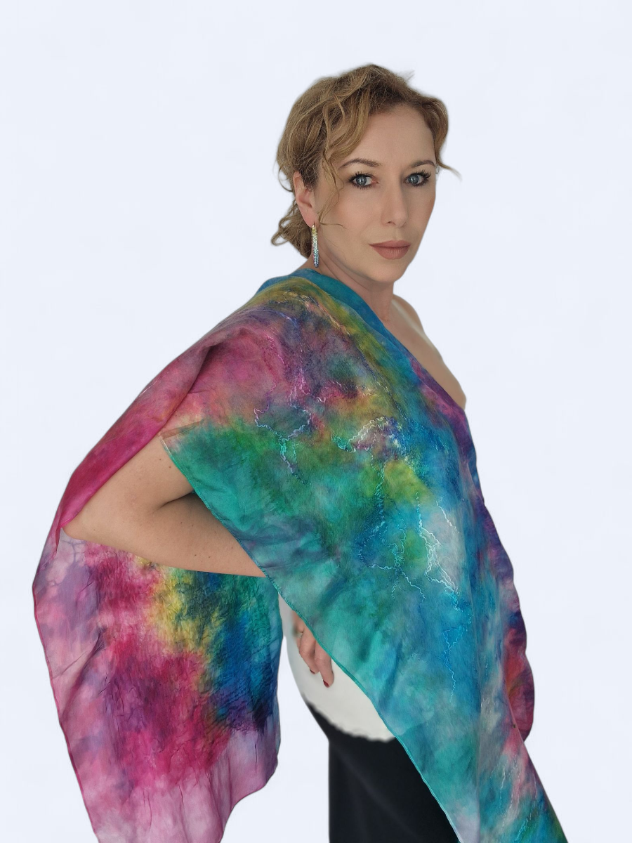 Ręcznie filcowany szal wykonany z jedwabiu habotai oraz delikatnej wełny z merynosów australijskich. Piękny i unikalny. Ozdobiony jedwabnymi włóknami. Zwiewny, lekki, delikatny i niegryzący. Ręcznie barwiony. Można nosić go niedbale owiniętym wokół szyi jak i zarzuconym na ramiona. Szal filcowany na szyfonie jedwabnym.
