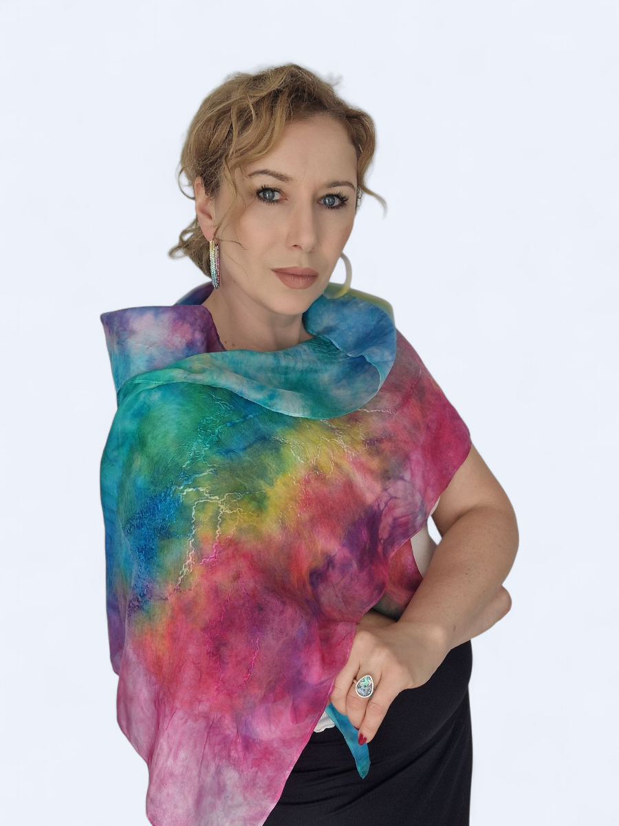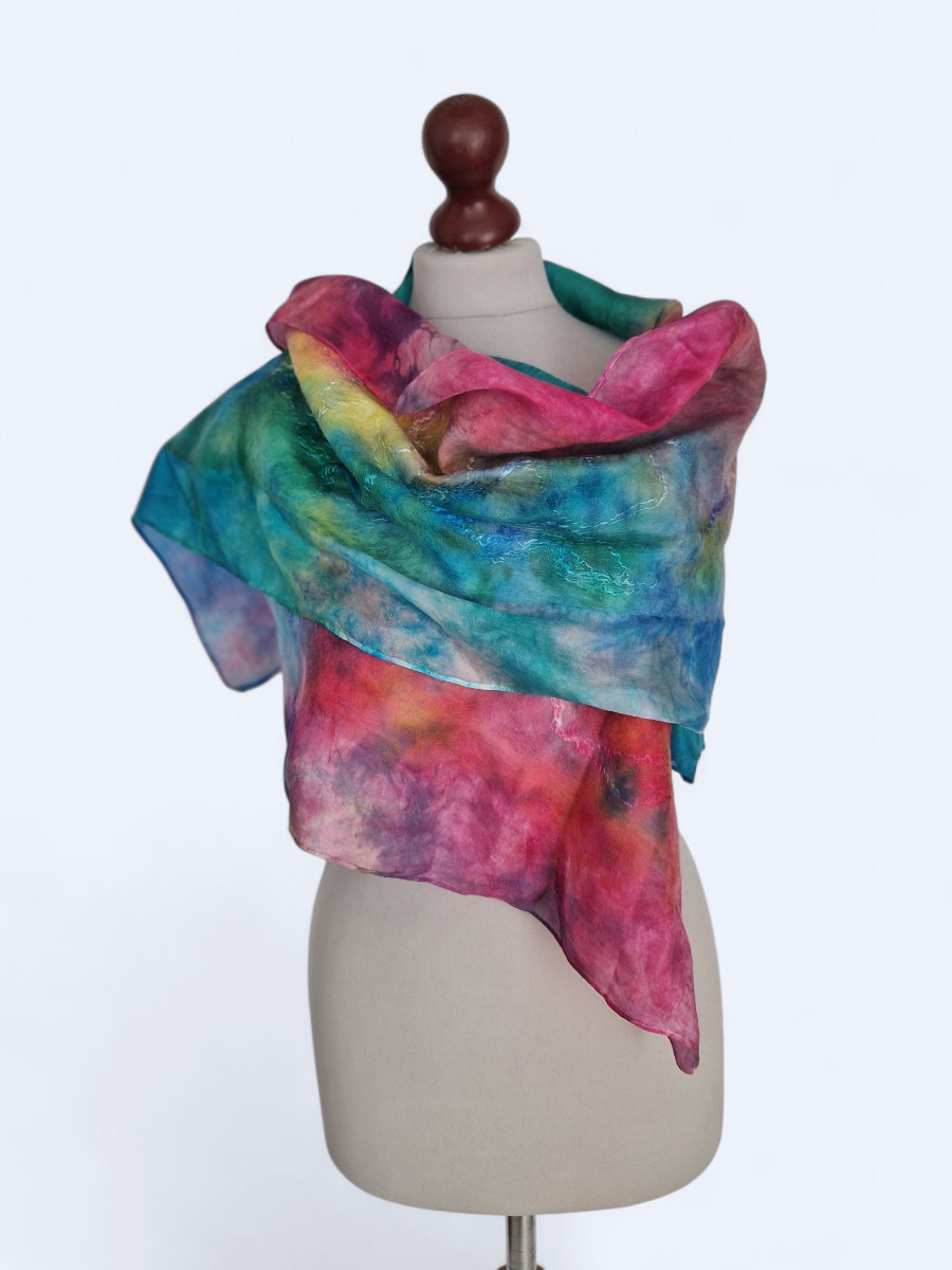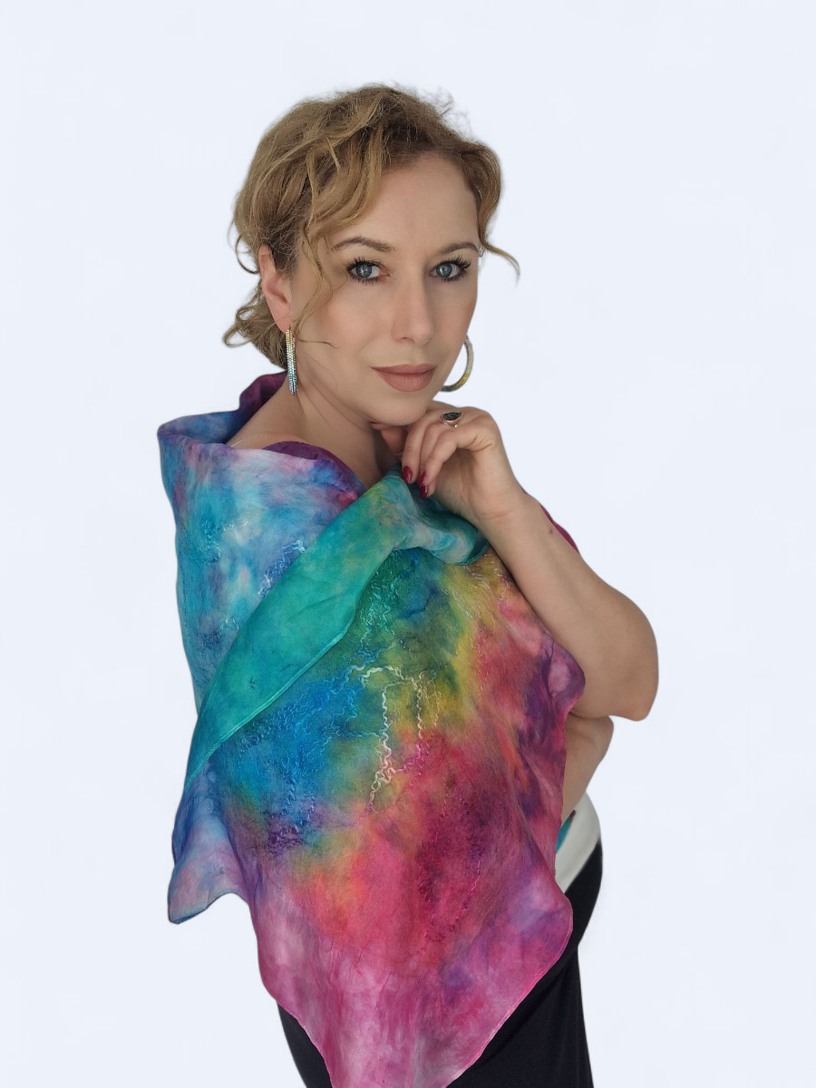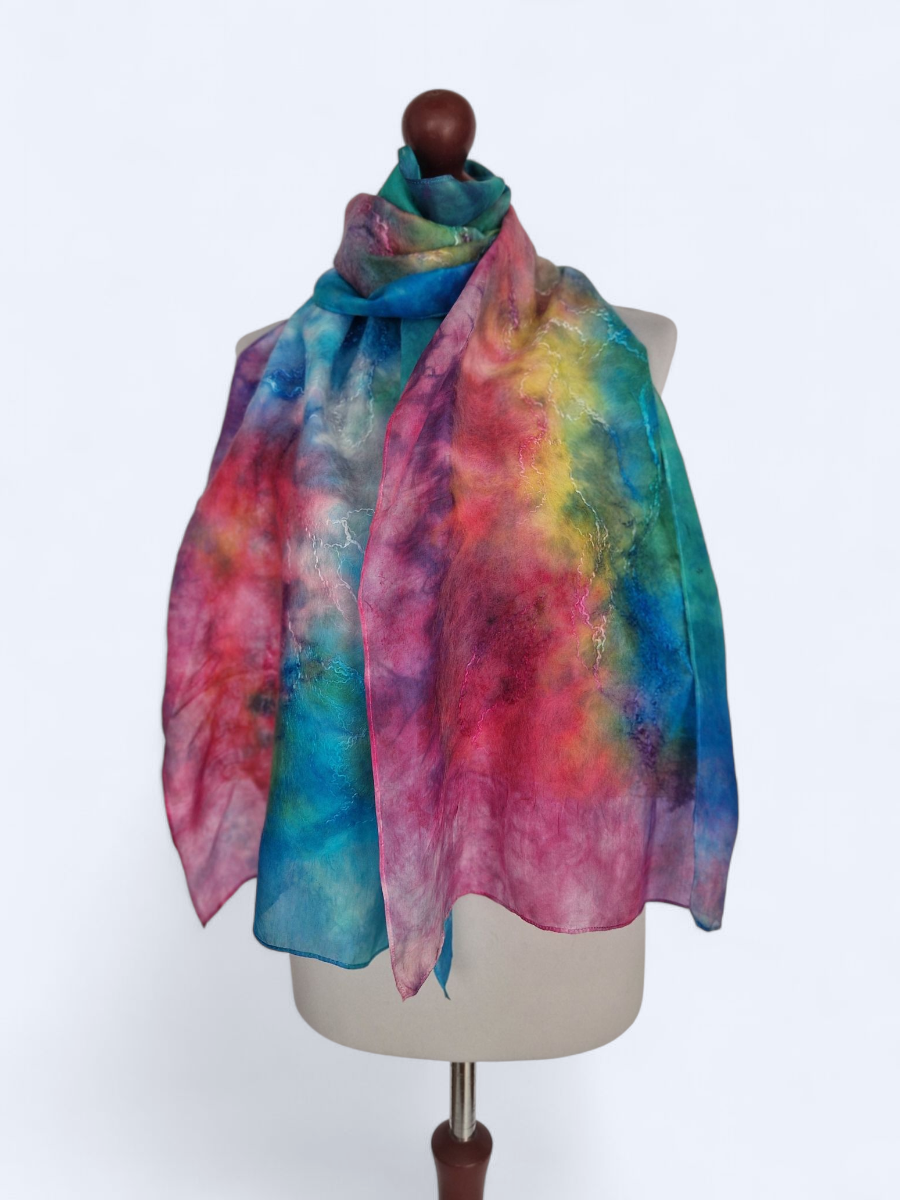 Ręcznie filcowany szal wykonany z jedwabiu habotai oraz delikatnej wełny z merynosów australijskich. Piękny i unikalny. Ozdobiony jedwabnymi włóknami. Zwiewny, lekki, delikatny i niegryzący. Ręcznie barwiony. Można nosić go niedbale owiniętym wokół szyi jak i zarzuconym na ramiona. Szal filcowany na szyfonie jedwabnym.
