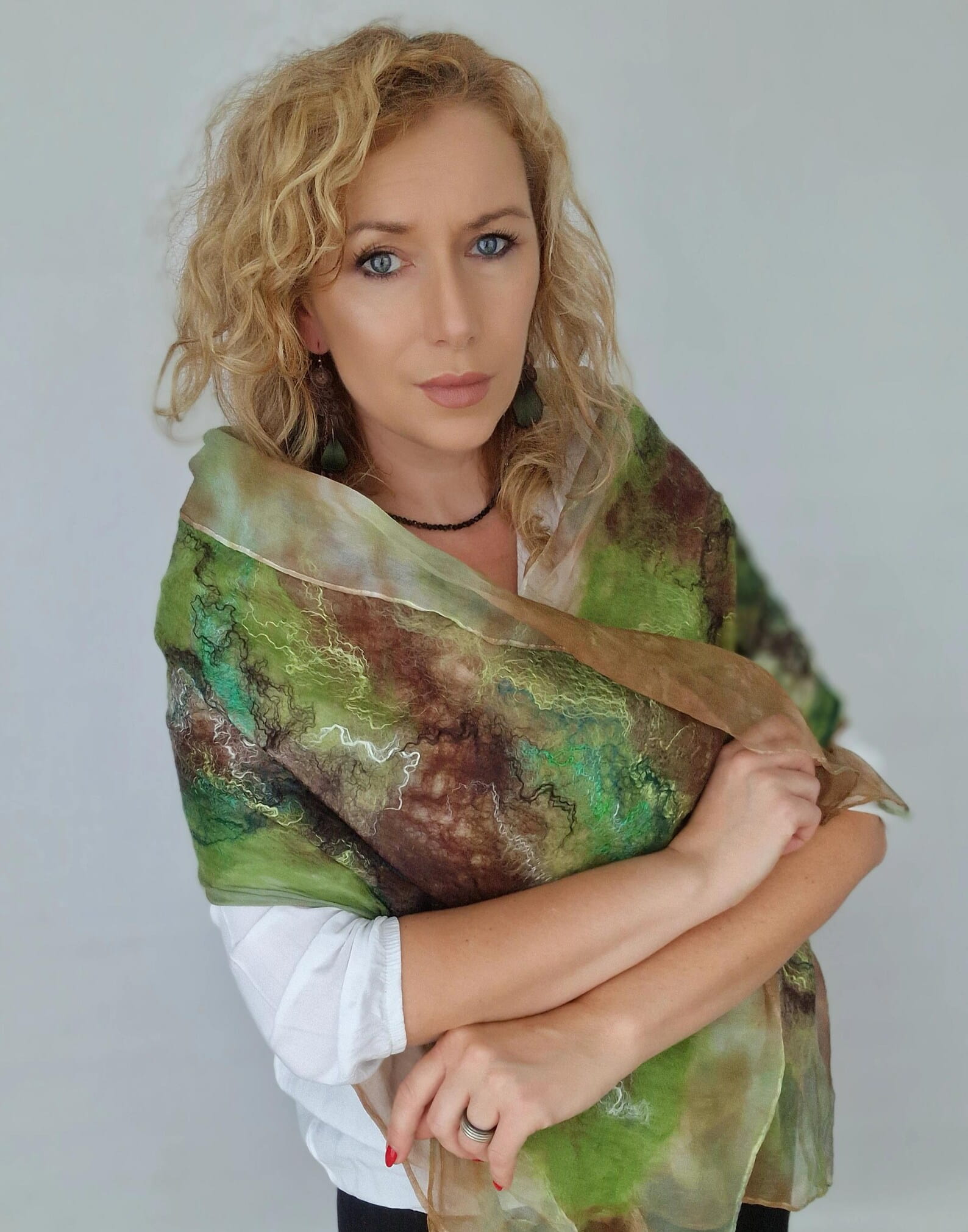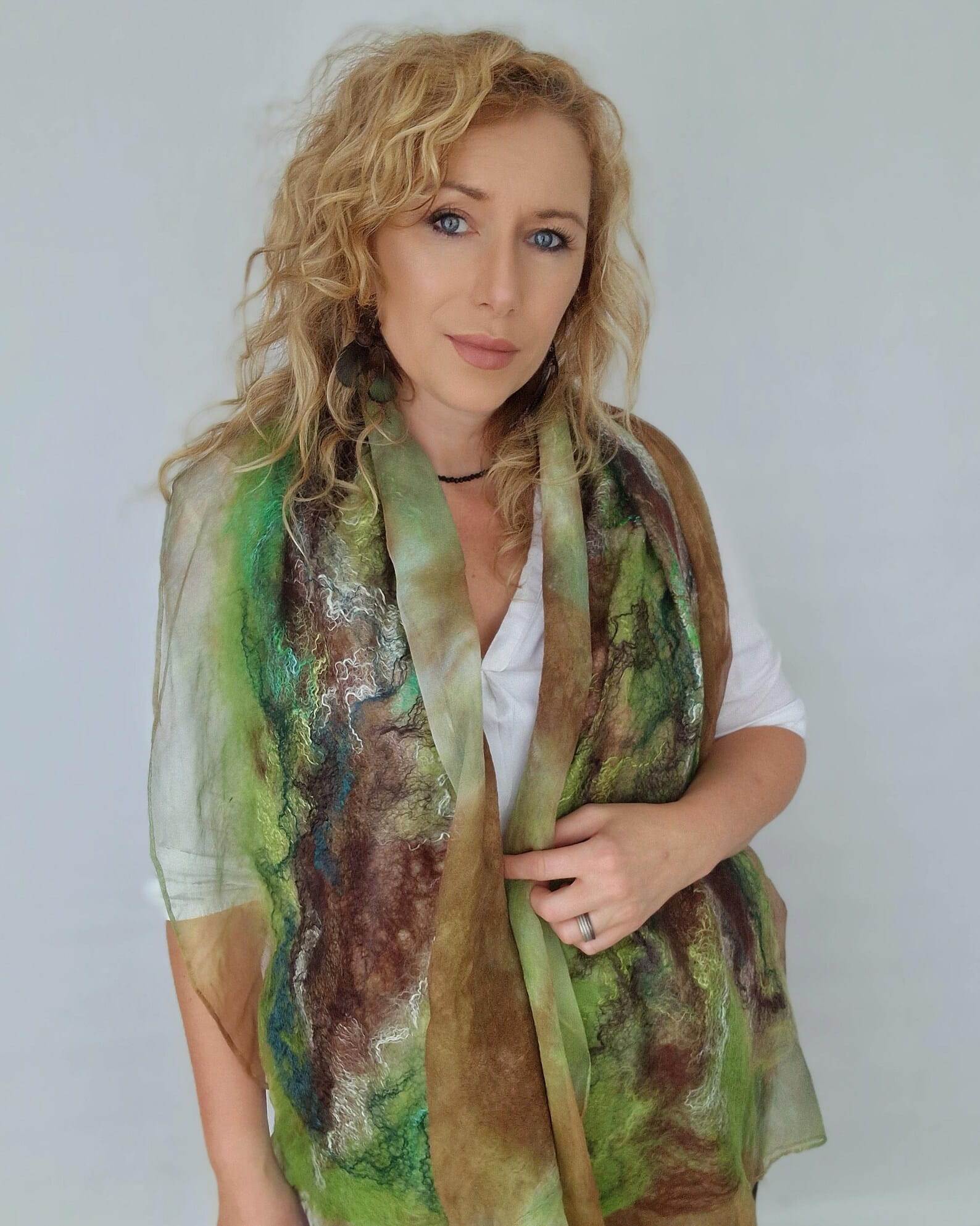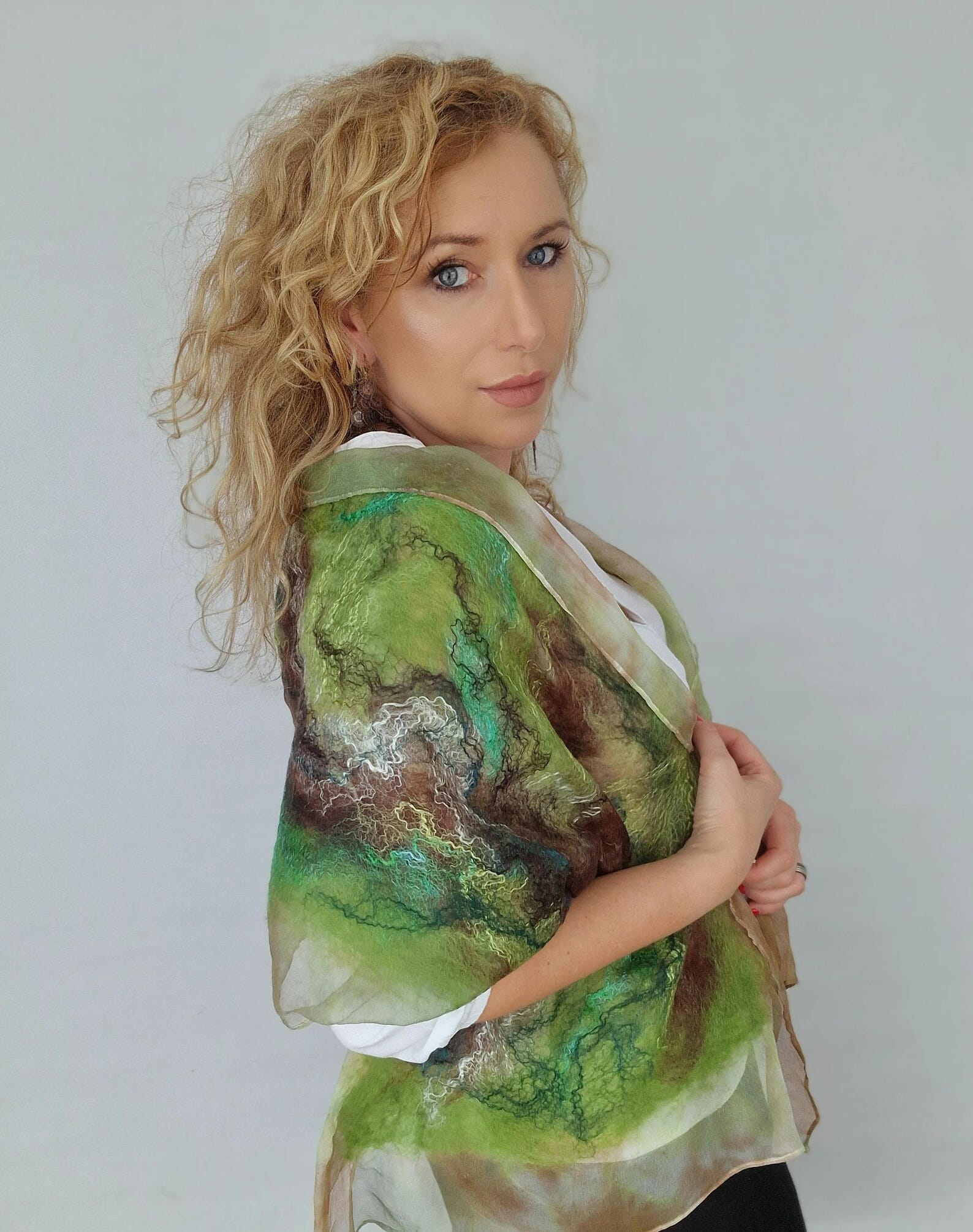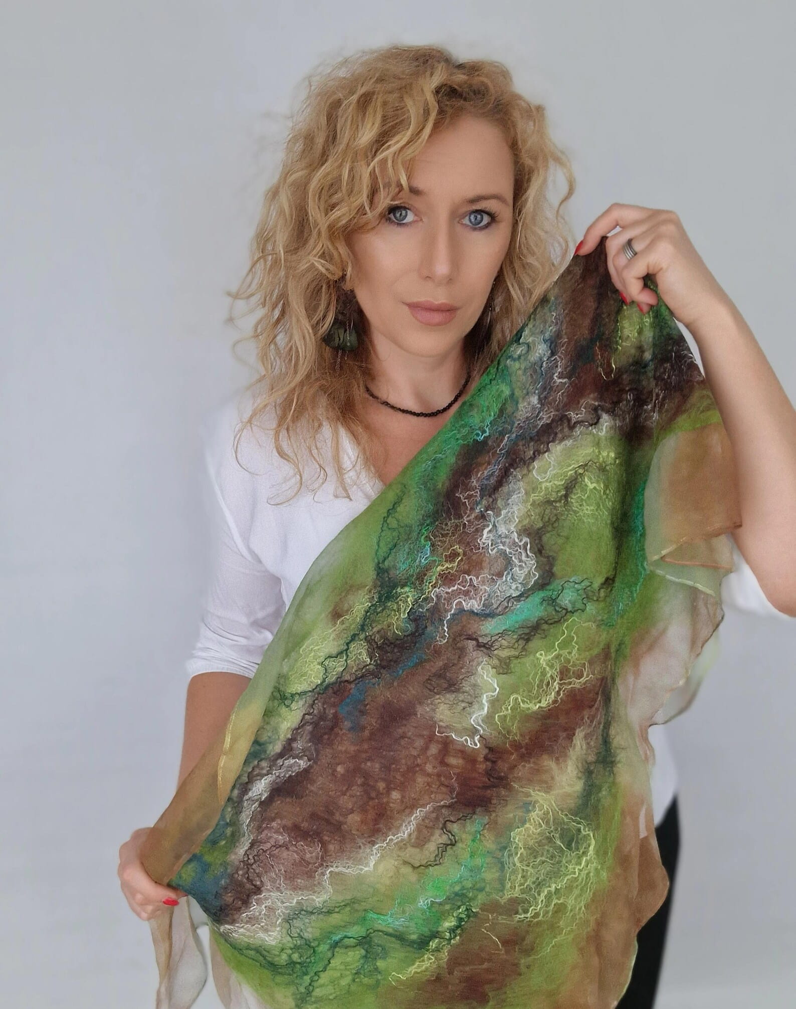 Wełniany szal filcowany na jedwabiu.