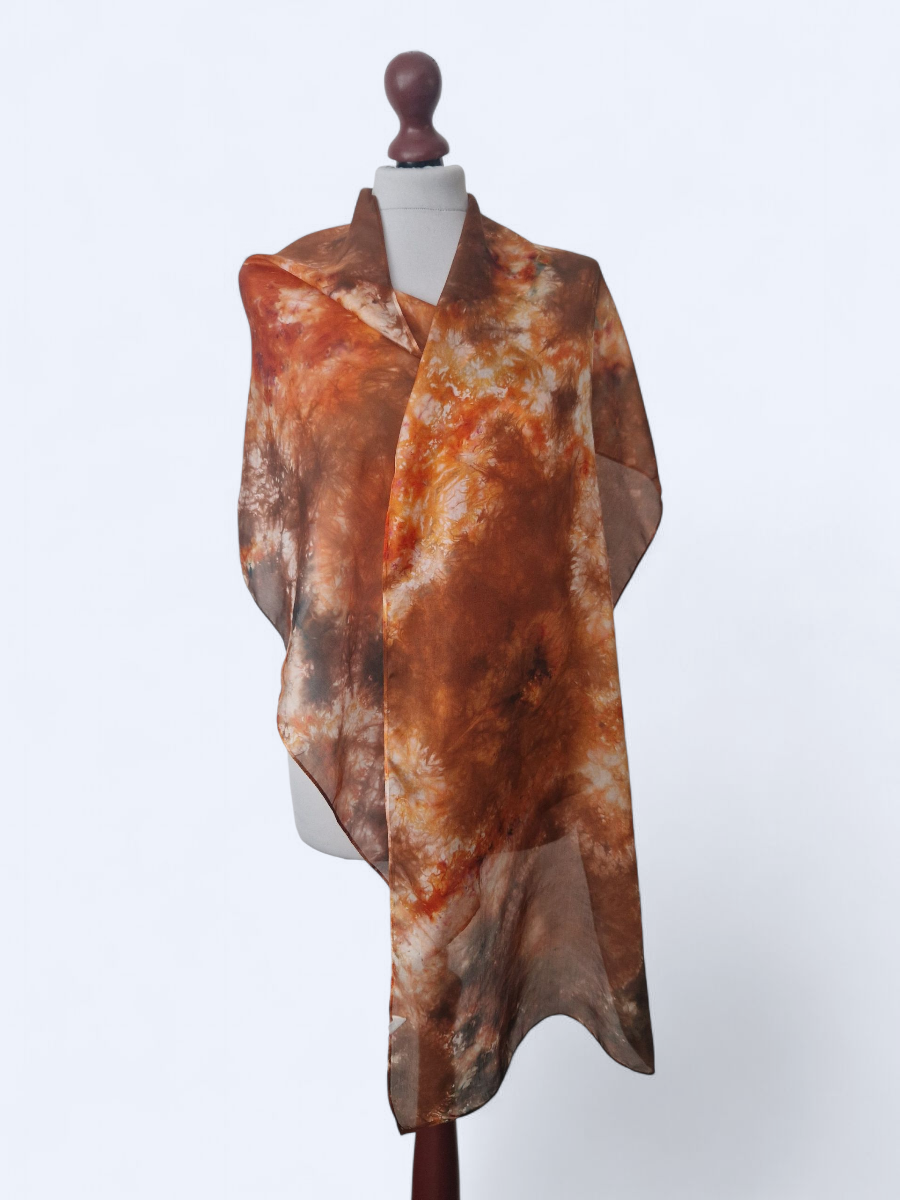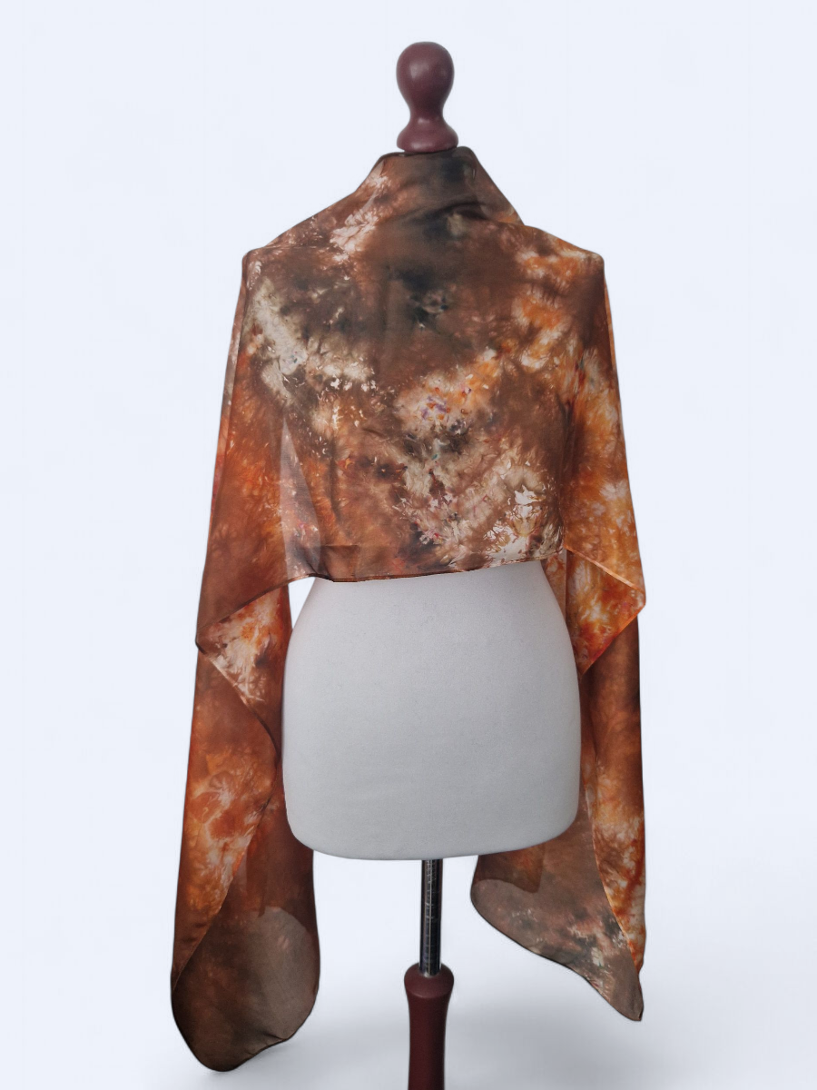 Wyjątkowy szal wykonany w 100% z jedwabiu habotai – synonim luksusu i subtelnej elegancji. Ręcznie barwiony przy użyciu różnorodnych technik, w tym tradycyjnego Shibori, prezentuje unikalny wzór, który czyni każdą sztukę niepowtarzalną.