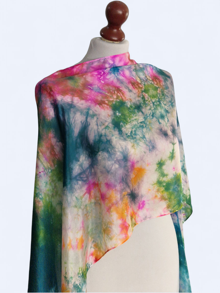 Wyjątkowy szal wykonany w 100% z jedwabiu habotai – synonim luksusu i subtelnej elegancji. Ręcznie barwiony przy użyciu różnorodnych technik, w tym tradycyjnego Shibori, prezentuje unikalny wzór, który czyni każdą sztukę niepowtarzalną.