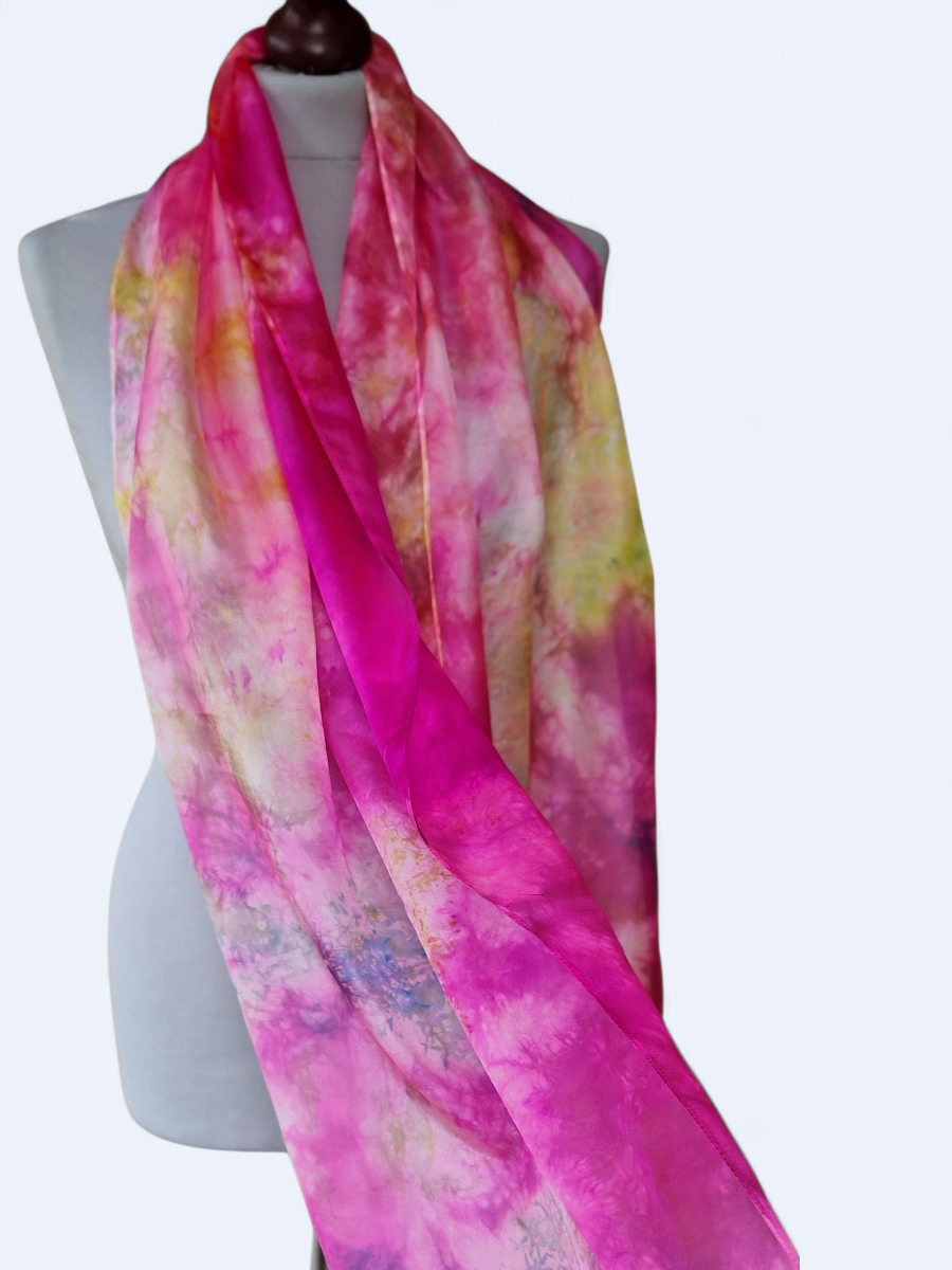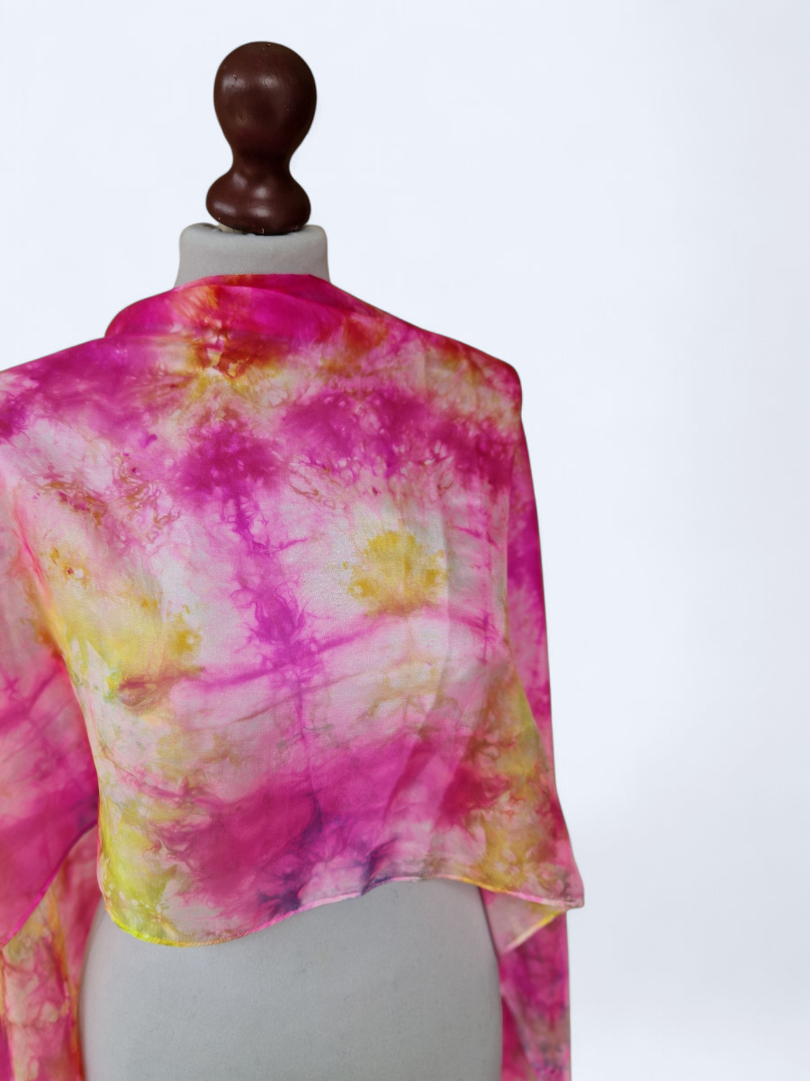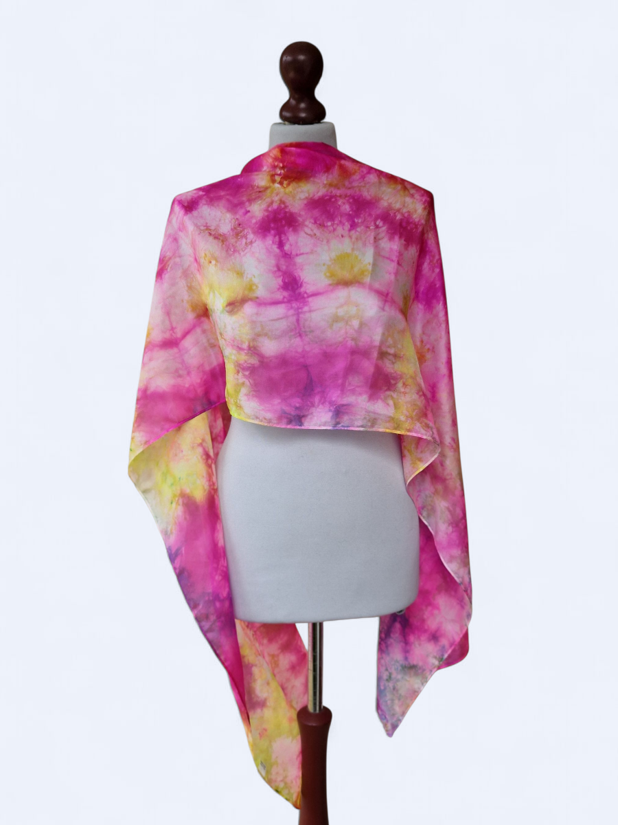 Wyjątkowy szal wykonany w 100% z jedwabiu habotai – synonim luksusu i subtelnej elegancji. Ręcznie barwiony przy użyciu różnorodnych technik, w tym tradycyjnego Shibori, prezentuje unikalny wzór, który czyni każdą sztukę niepowtarzalną.
