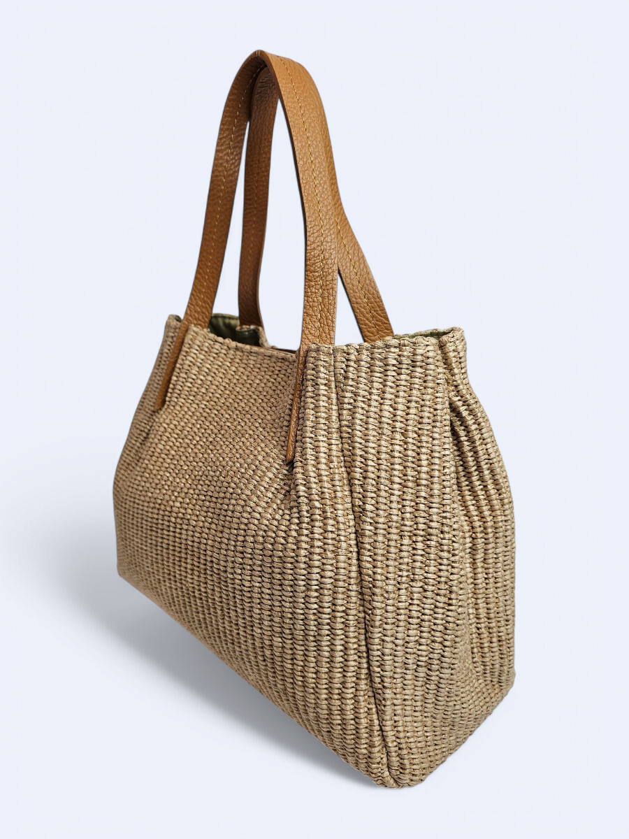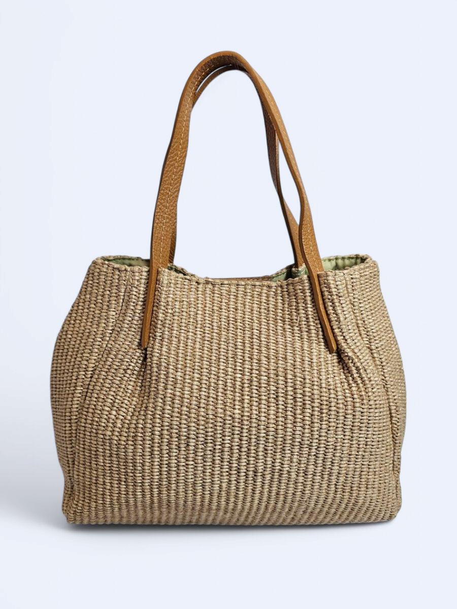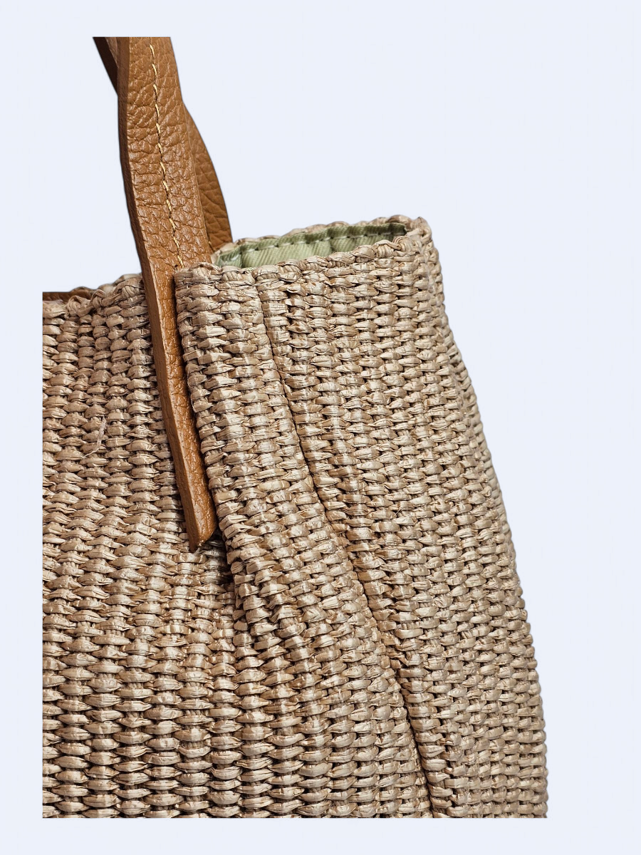 Torebka koszyk pleciona z rafii. Skórzane uszy.