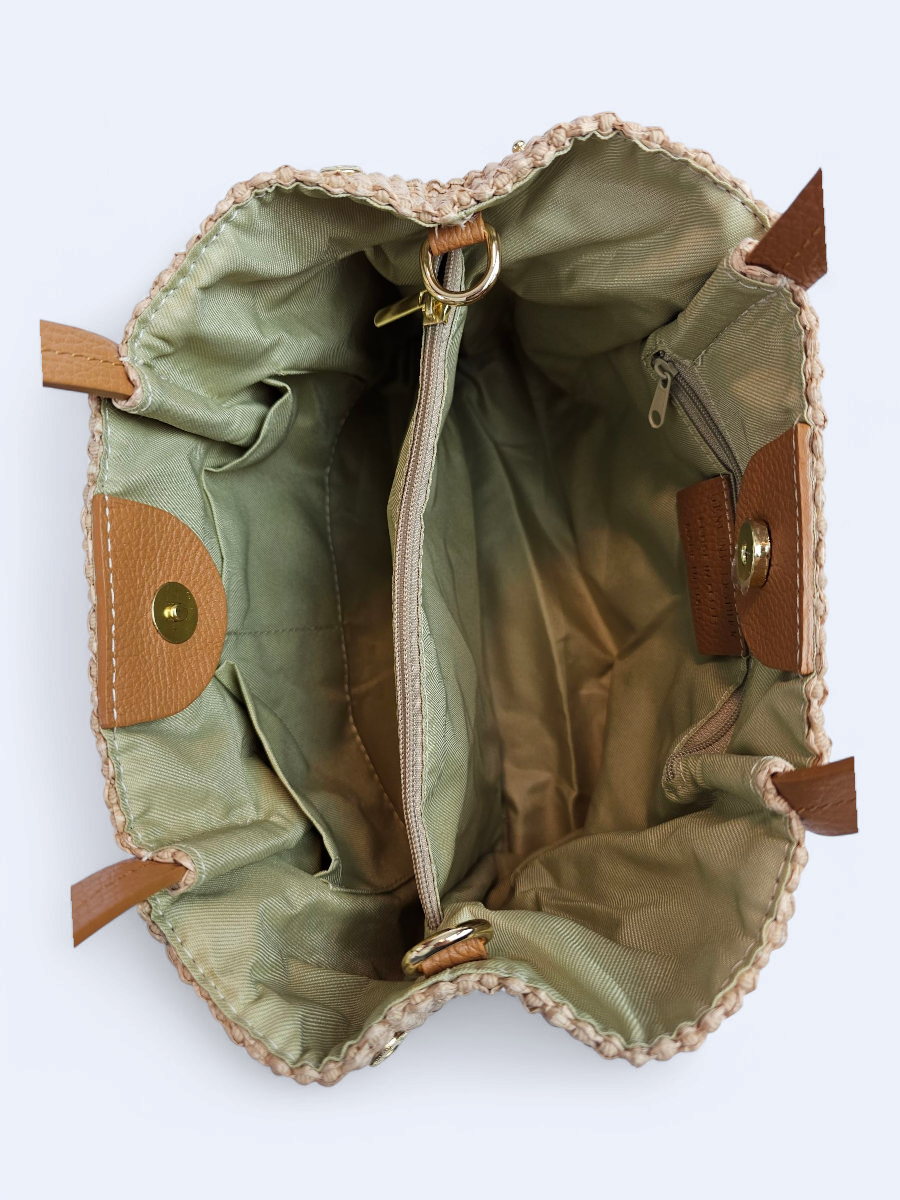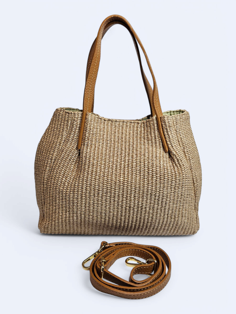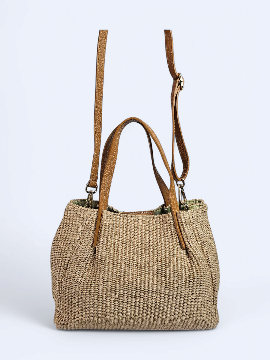 Torebka koszyk pleciona z rafii. Skórzane uszy.