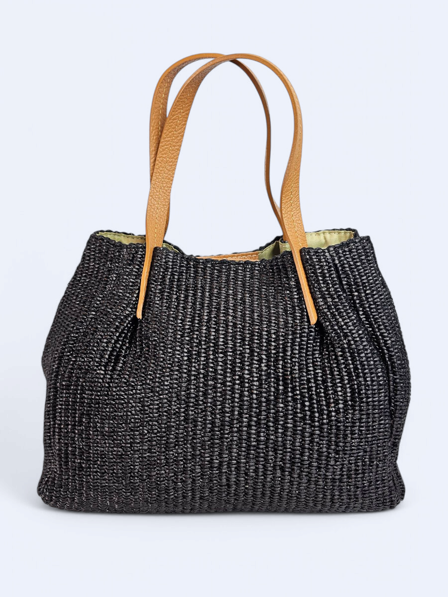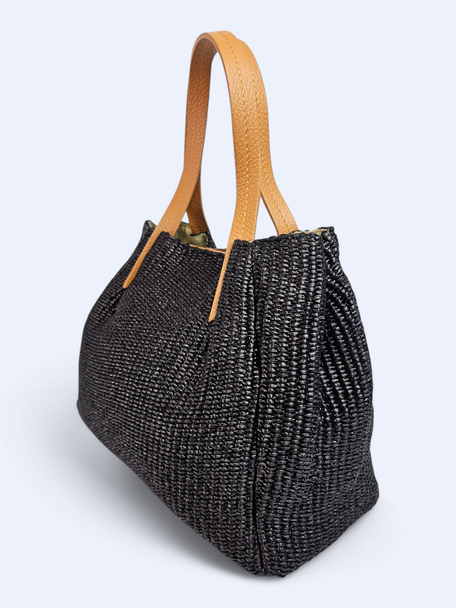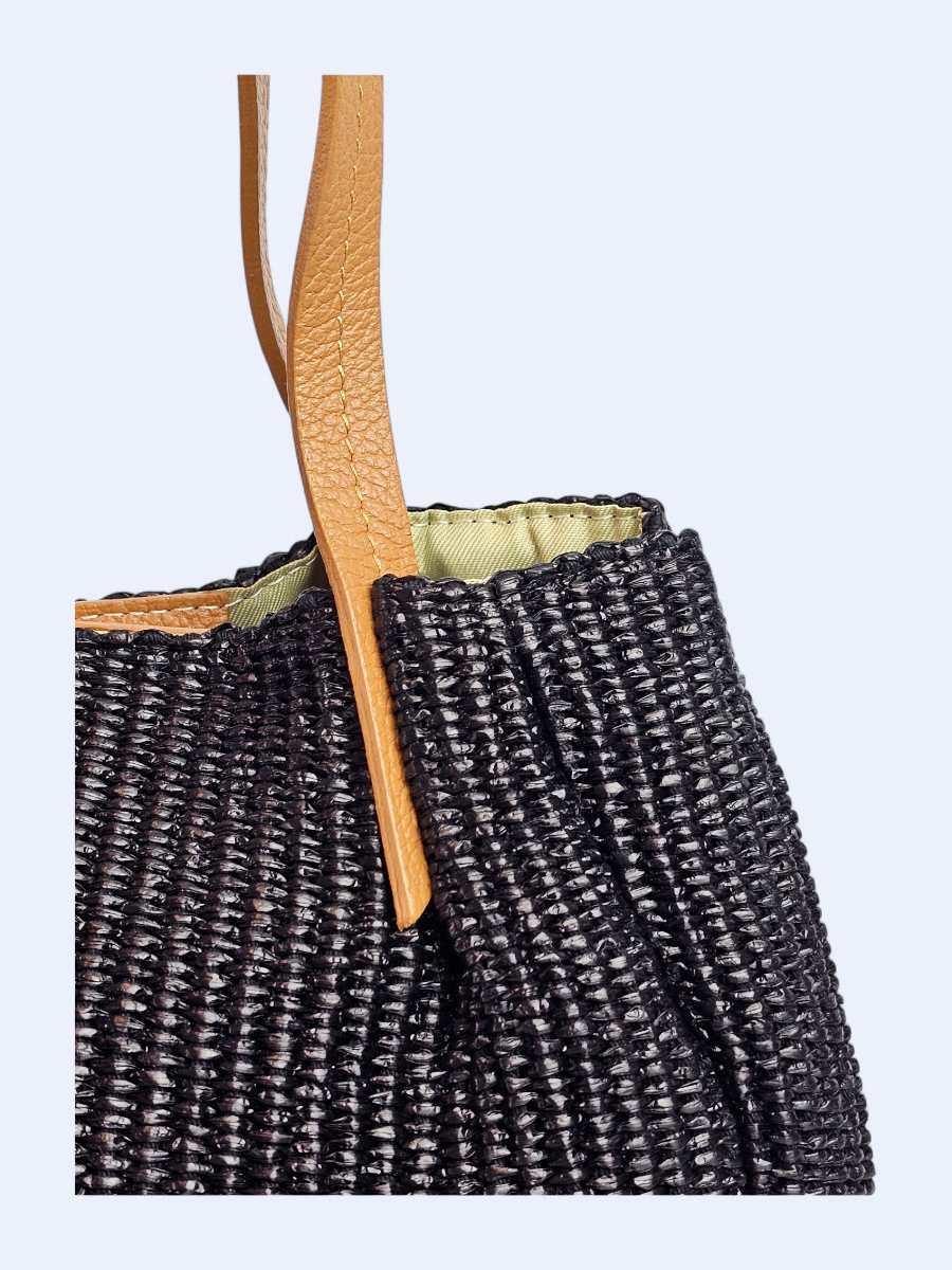 Torebka koszyk pleciona z rafii. Skórzane uszy.