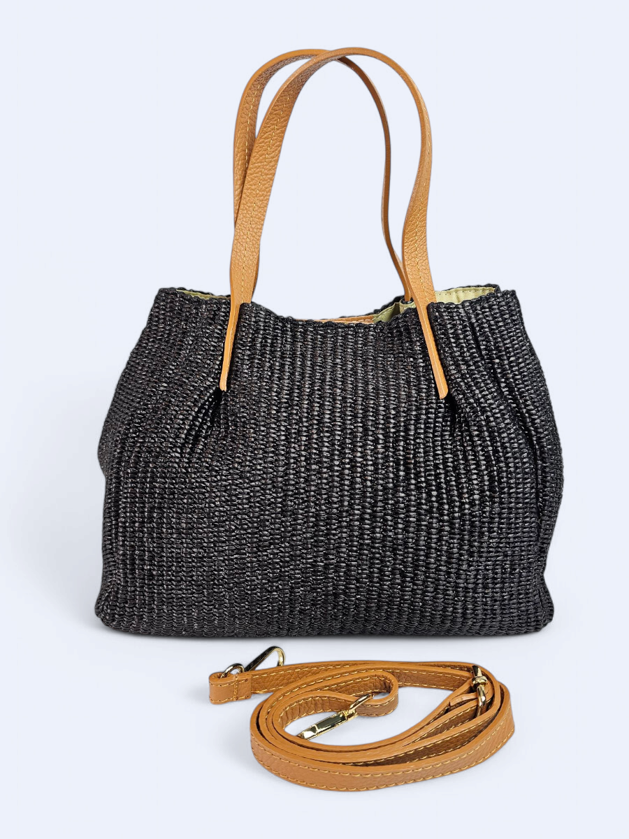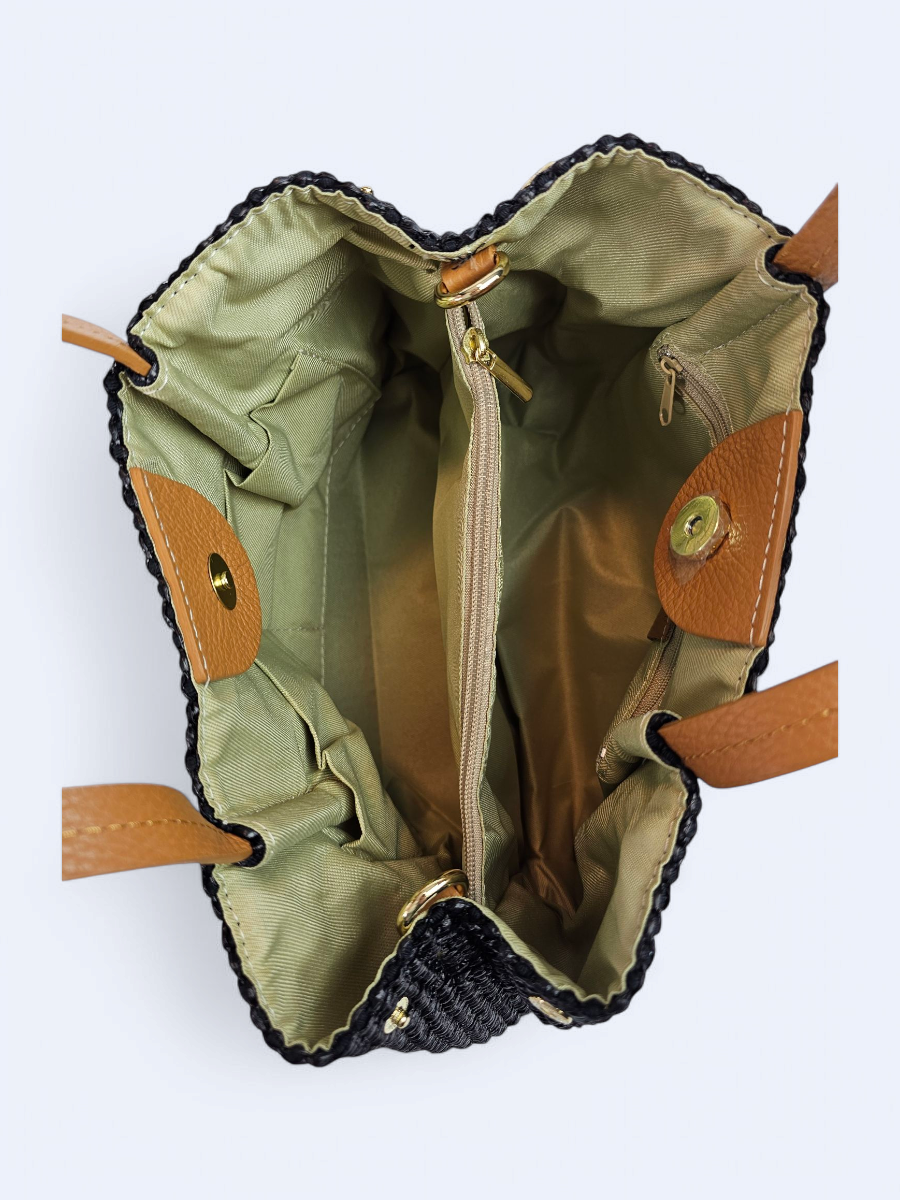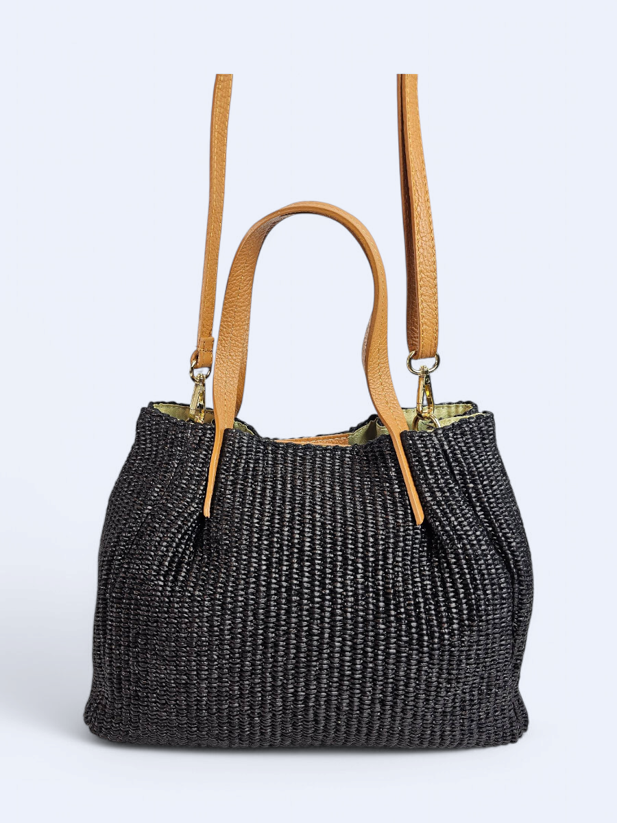 Torebka koszyk pleciona z rafii. Skórzane uszy.