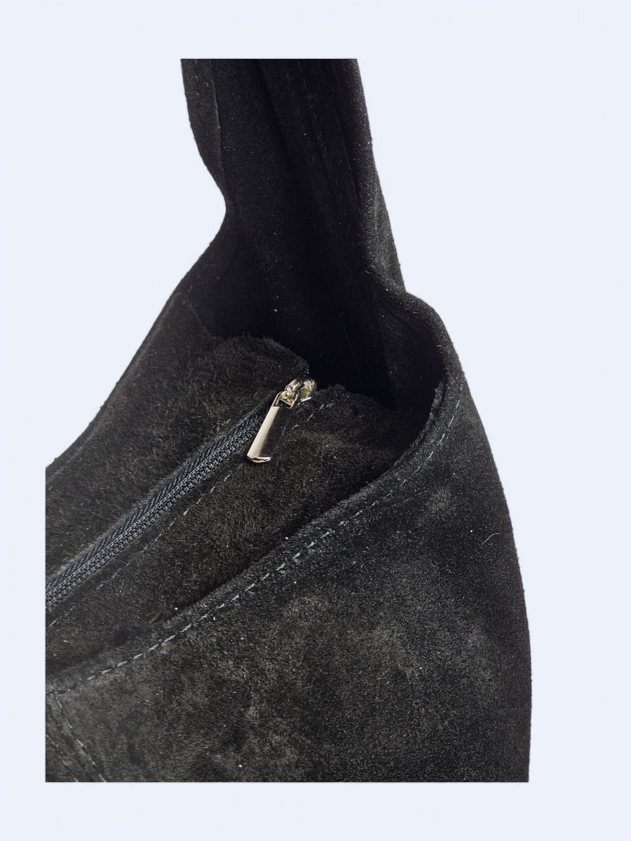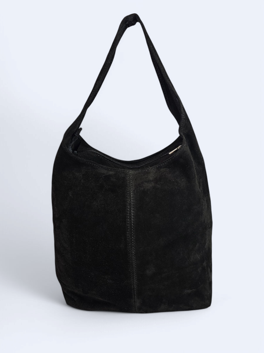 Duża torba wykonana z miękkiego zamszu. Ma klasyczny zaokrąglony kształt hobo bag. Jej lekko opadająca forma podkreśla swobodny charakter i sprawia, że naturalnie dopasowuje się do sylwetki, zapewniając wygodę noszenia na co dzień. Pojemne wnętrze worka sprawia, że pomieści wszystkie niezbędne rzeczy - od portfela i telefonu po kosmetyki czy książkę. Przemyślany design łączy funkcjonalność z minimalistyczną estetyką. Wnętrze torby zabezpieczone zamkiem błyskawicznym.