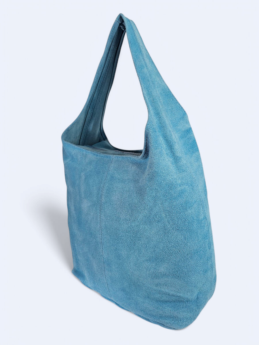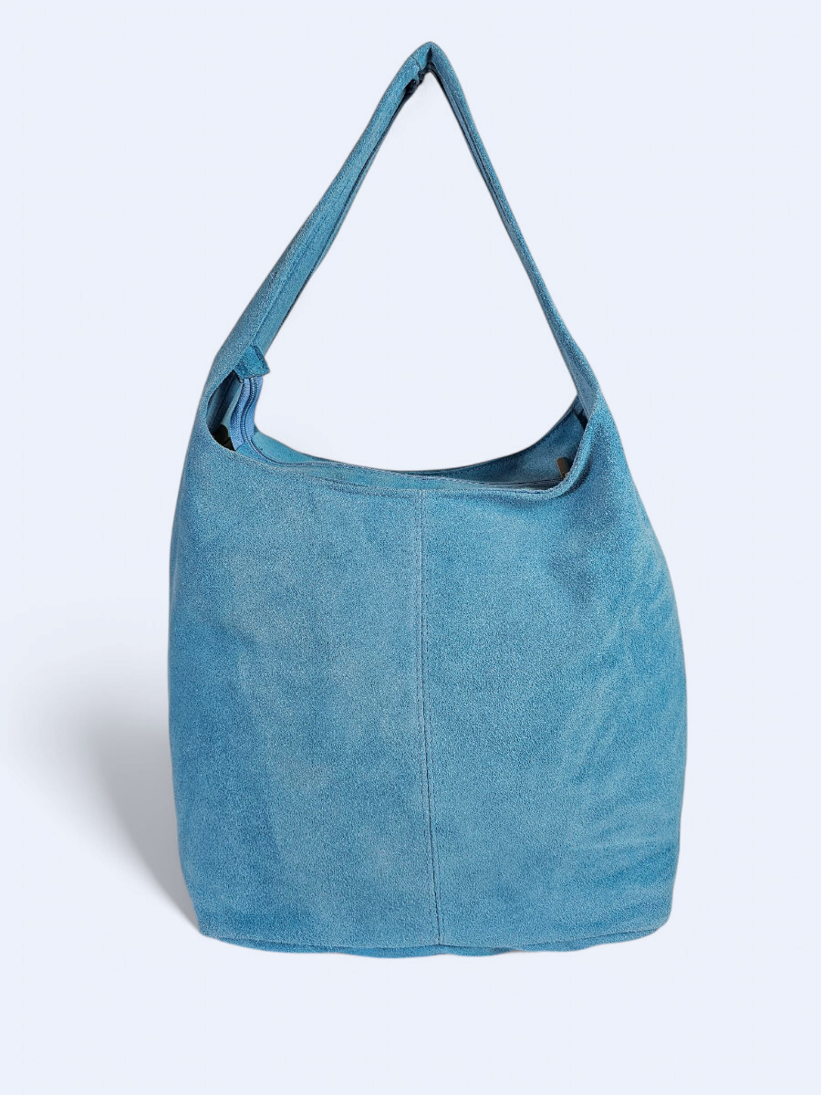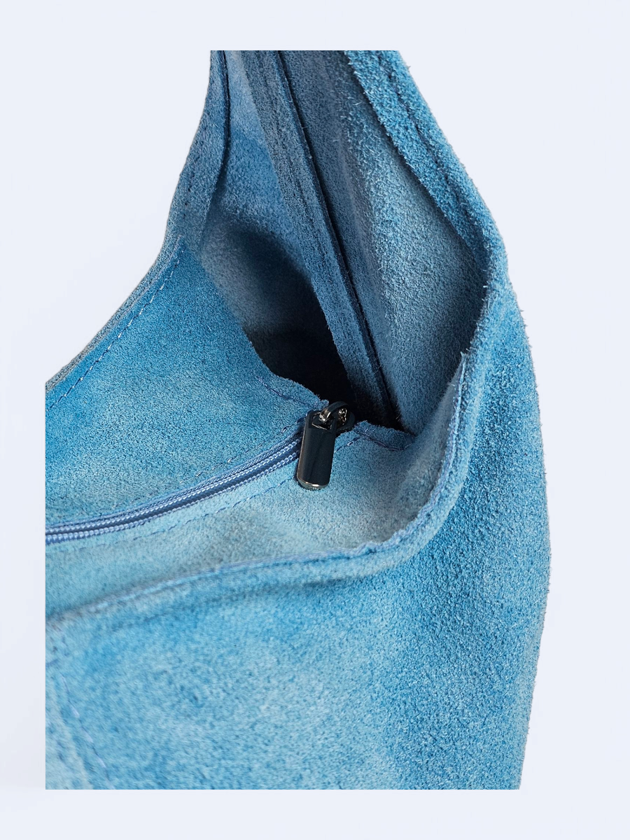 Duża torba wykonana z miękkiego zamszu. Ma klasyczny zaokrąglony kształt hobo bag. Jej lekko opadająca forma podkreśla swobodny charakter i sprawia, że naturalnie dopasowuje się do sylwetki, zapewniając wygodę noszenia na co dzień. Pojemne wnętrze worka sprawia, że pomieści wszystkie niezbędne rzeczy - od portfela i telefonu po kosmetyki czy książkę. Przemyślany design łączy funkcjonalność z minimalistyczną estetyką. Wnętrze torby zabezpieczone zamkiem błyskawicznym.