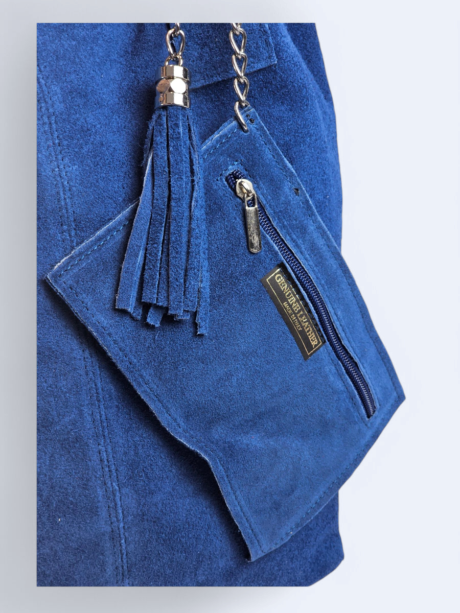 Długie, wygodne uszy umożliwiają komfortowe noszenie torby na ramieniu. Stylowym akcentem jest ozdobny łańcuszek z frędzlami, który dodaje całości charakteru. Po przeciwnej stronie łańcuszka znajduje się zamykana na suwak saszetka, idealna na drobiazgi.