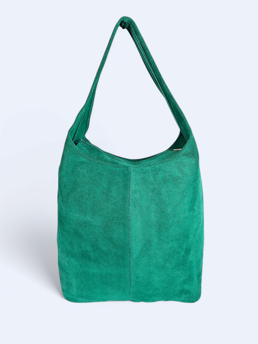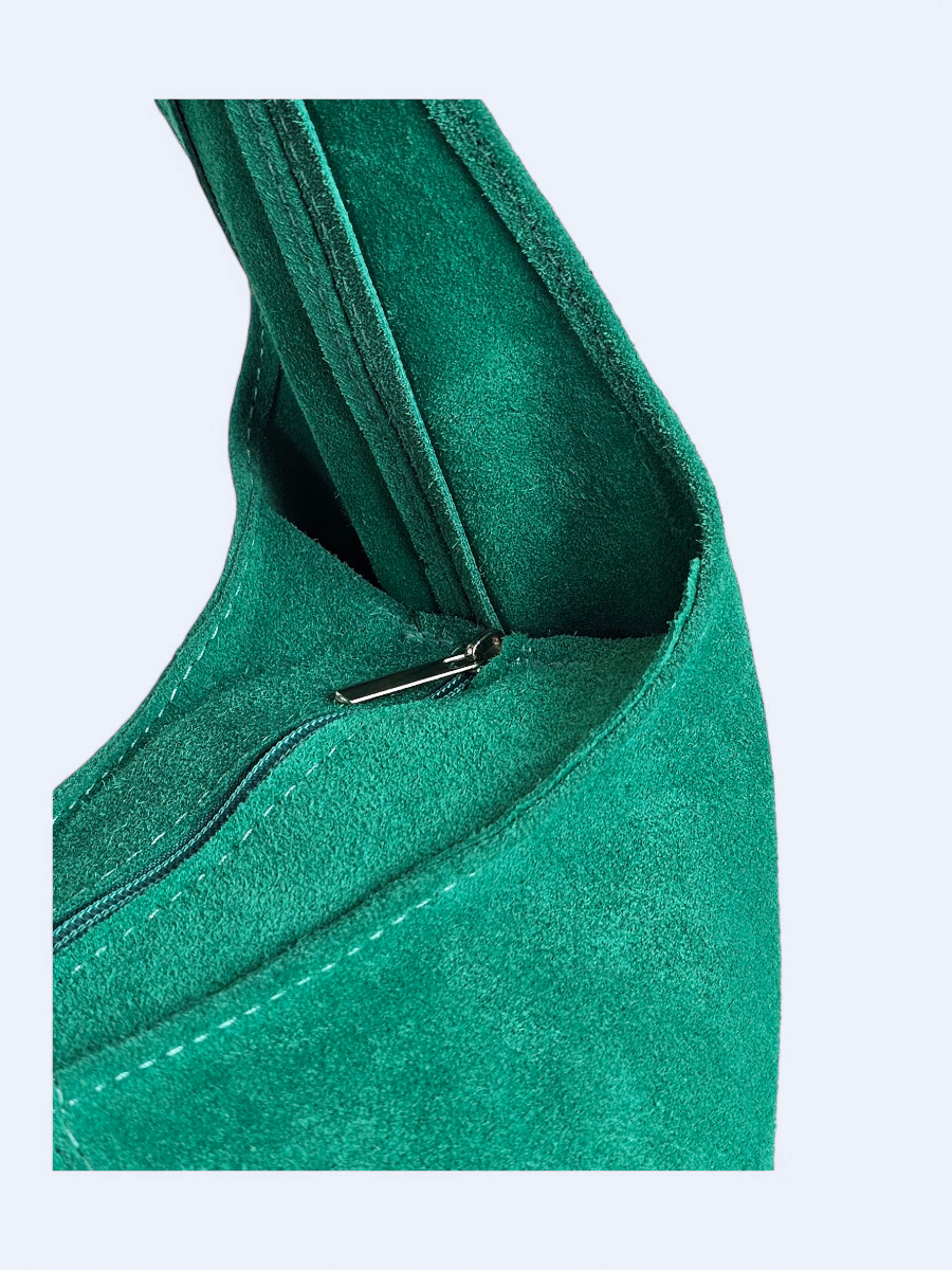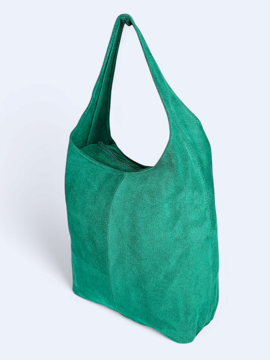 Duża torba wykonana z miękkiego zamszu. Ma klasyczny zaokrąglony kształt hobo bag. Jej lekko opadająca forma podkreśla swobodny charakter i sprawia, że naturalnie dopasowuje się do sylwetki, zapewniając wygodę noszenia na co dzień. Pojemne wnętrze worka sprawia, że pomieści wszystkie niezbędne rzeczy - od portfela i telefonu po kosmetyki czy książkę. Przemyślany design łączy funkcjonalność z minimalistyczną estetyką. Wnętrze torby zabezpieczone zamkiem błyskawicznym.