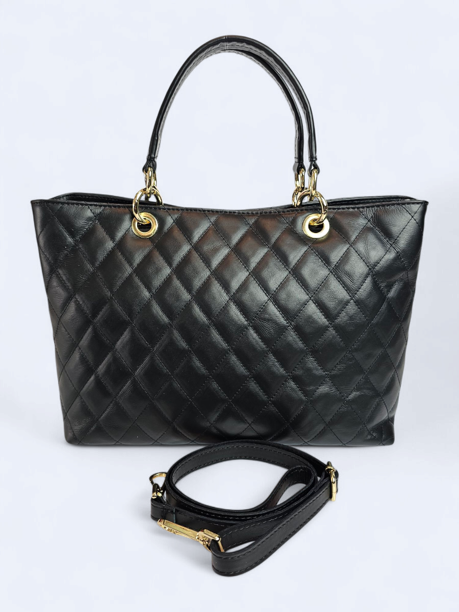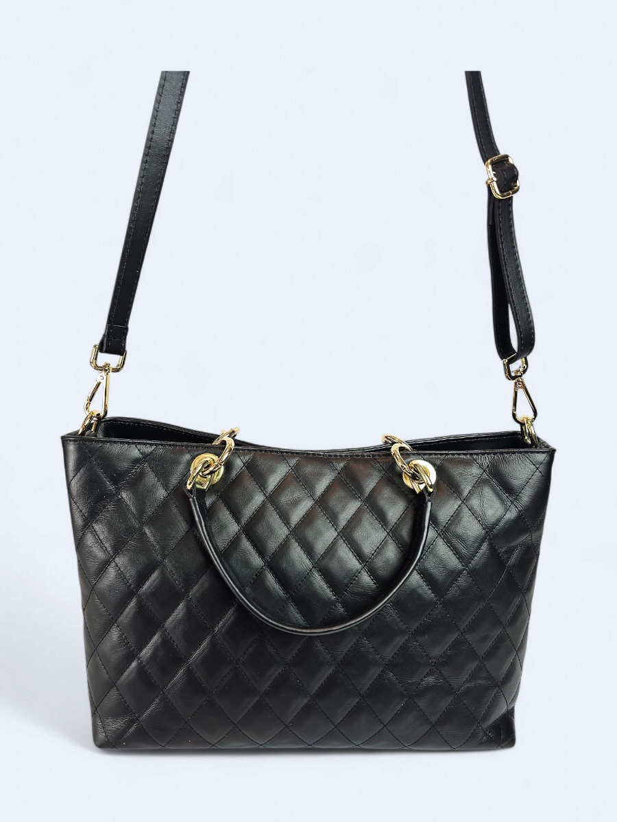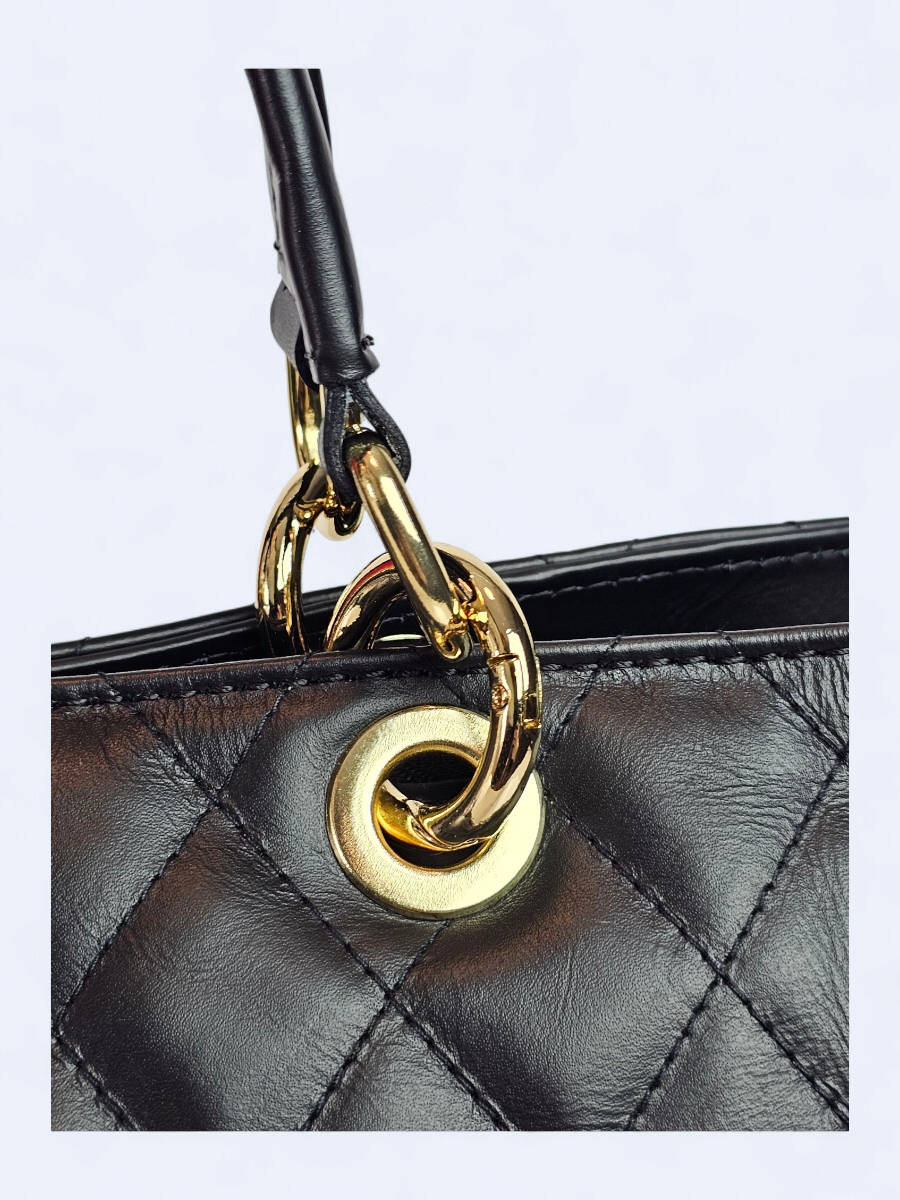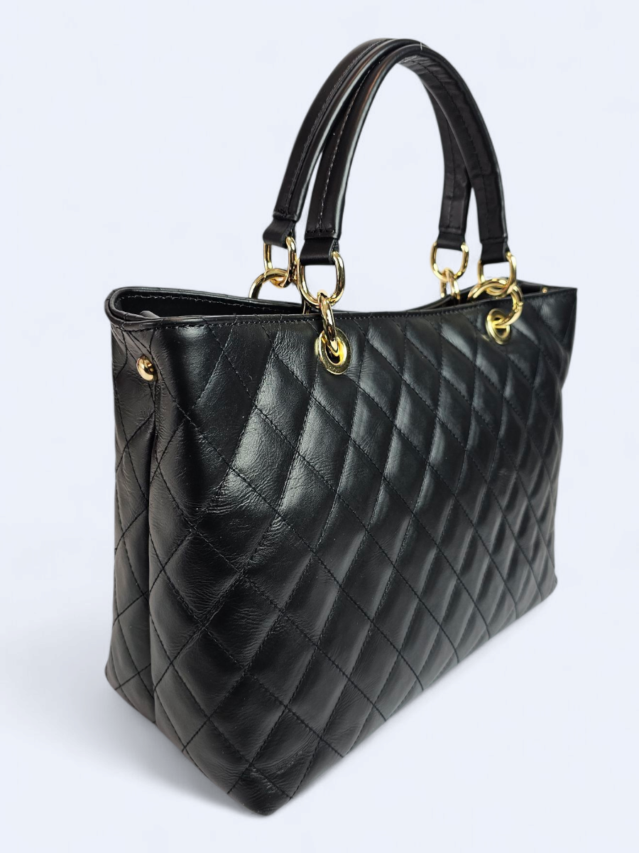 Elegancka czarna torebka wykonana z wysokiej jakości skóry naturalnej, wyróżniająca się eleganckim pikowaniem i klasyczną formą. Idealna zarówno do codziennych, jak i bardziej formalnych stylizacji.