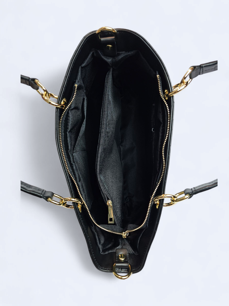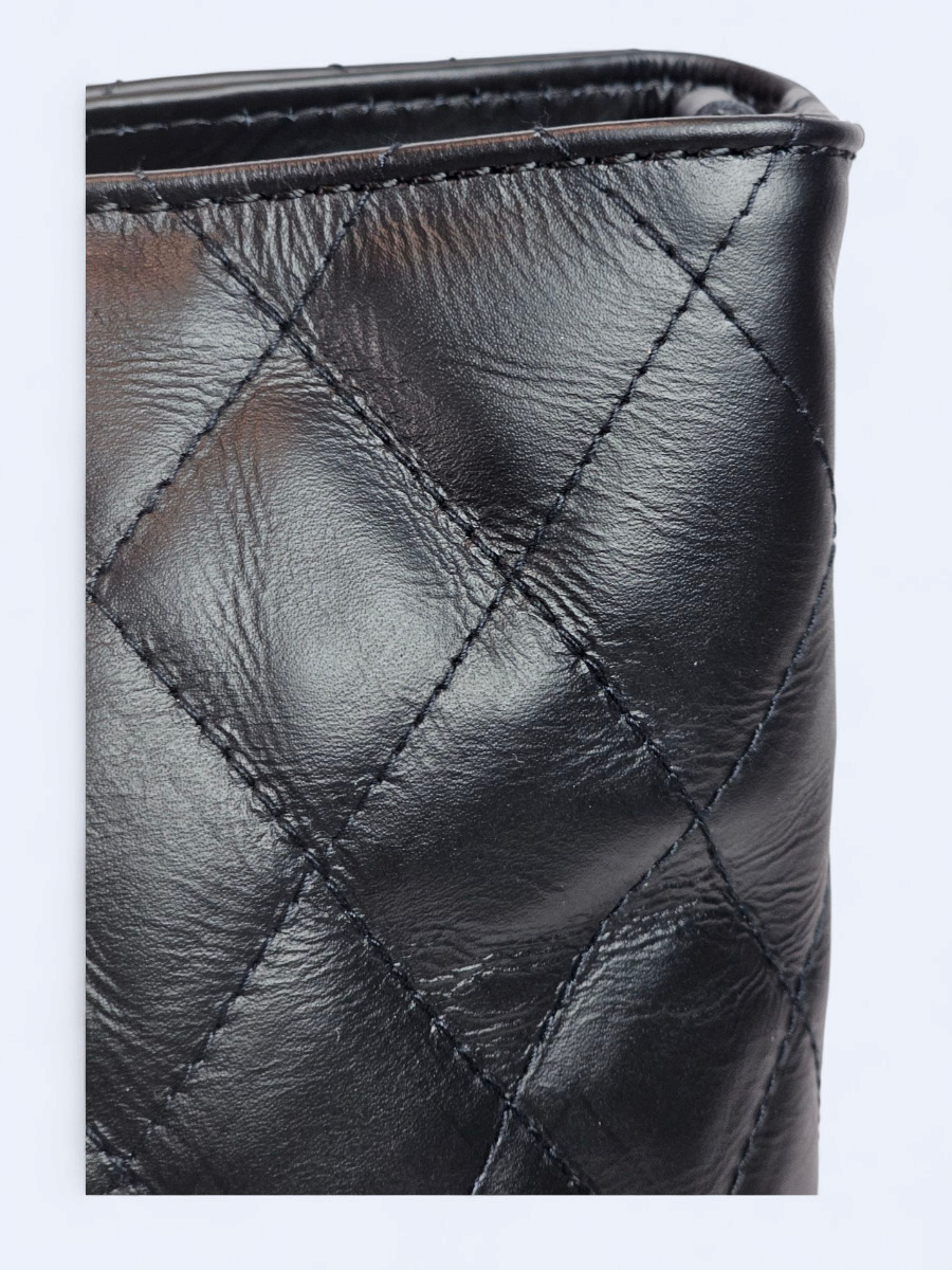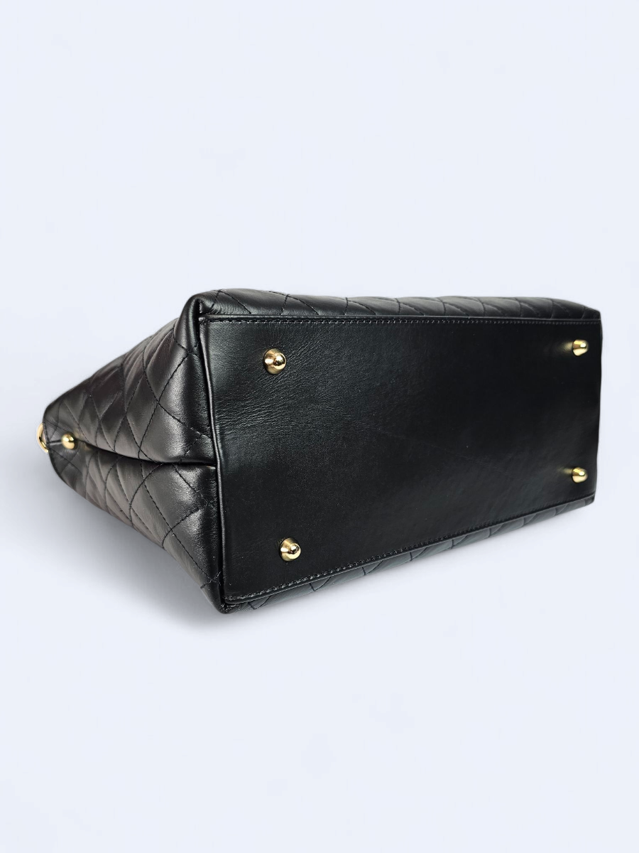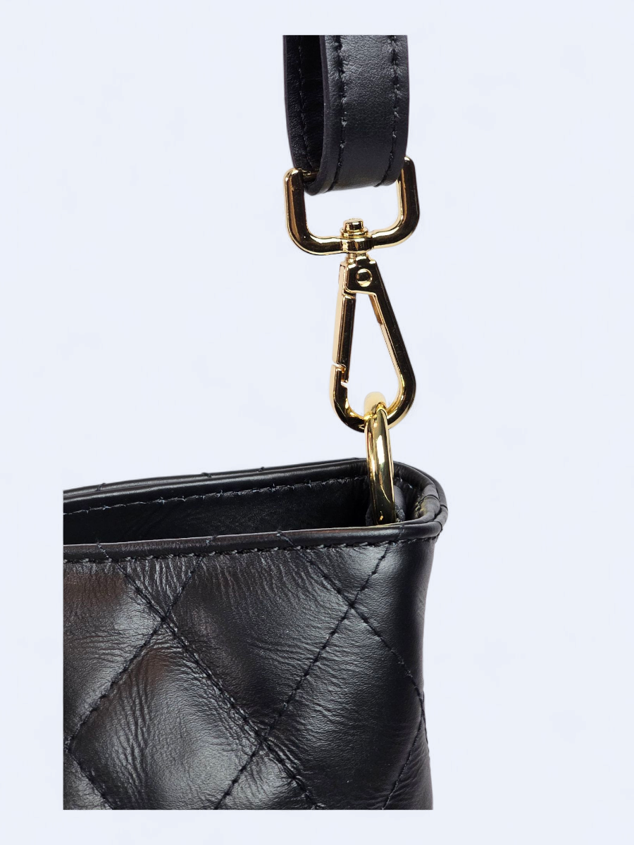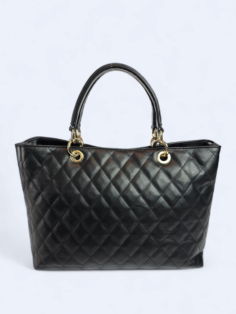 Elegancka czarna torebka wykonana z wysokiej jakości skóry naturalnej, wyróżniająca się eleganckim pikowaniem i klasyczną formą. Idealna zarówno do codziennych, jak i bardziej formalnych stylizacji.