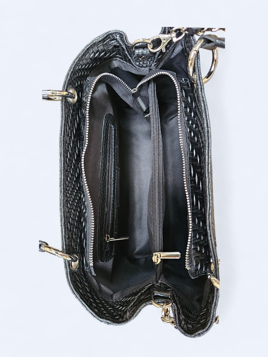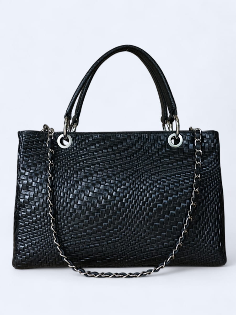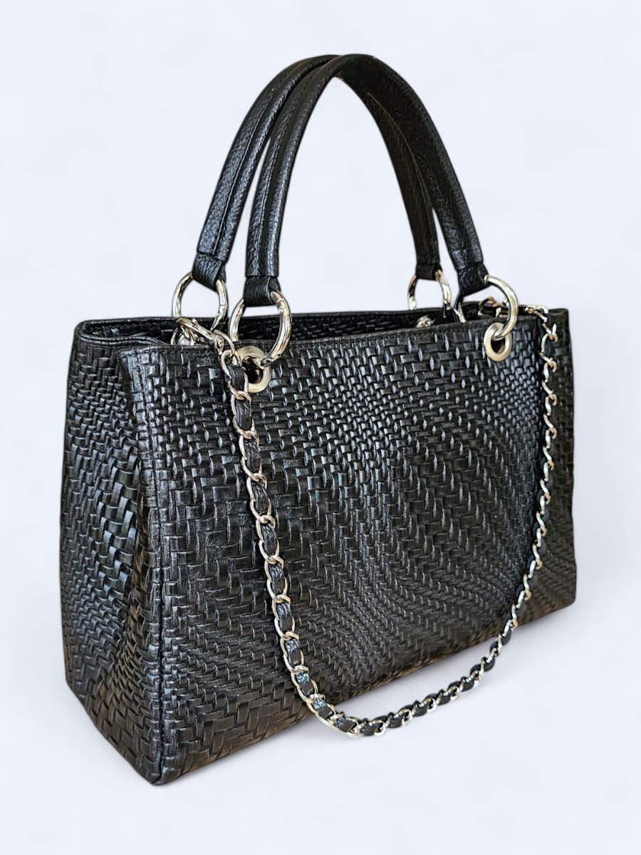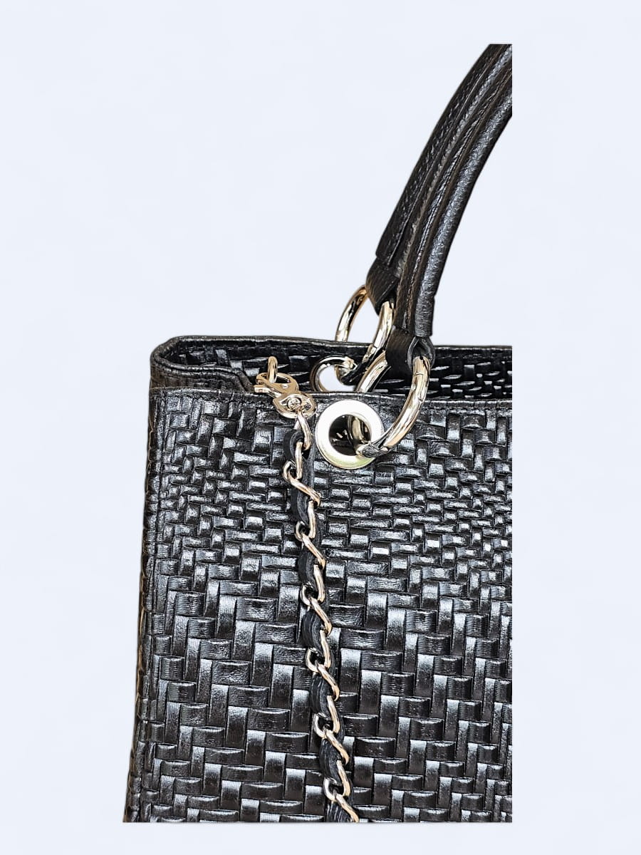 Ta pojemna torebka wykonana jest z najwyższej jakości skóry, która zachwyca swoją trwałością. Jej oryginalny, tłoczony wzór dodaje charakteru, podkreślając luksusowy wygląd oraz precyzję rzemiosła. Torebka oferuje dwie wygodne opcje noszenia – tradycyjne uchwyty umożliwiają eleganckie przenoszenie, a dołączony pasek z łańcuszkiem pozwala na stylowe noszenie na ramieniu.