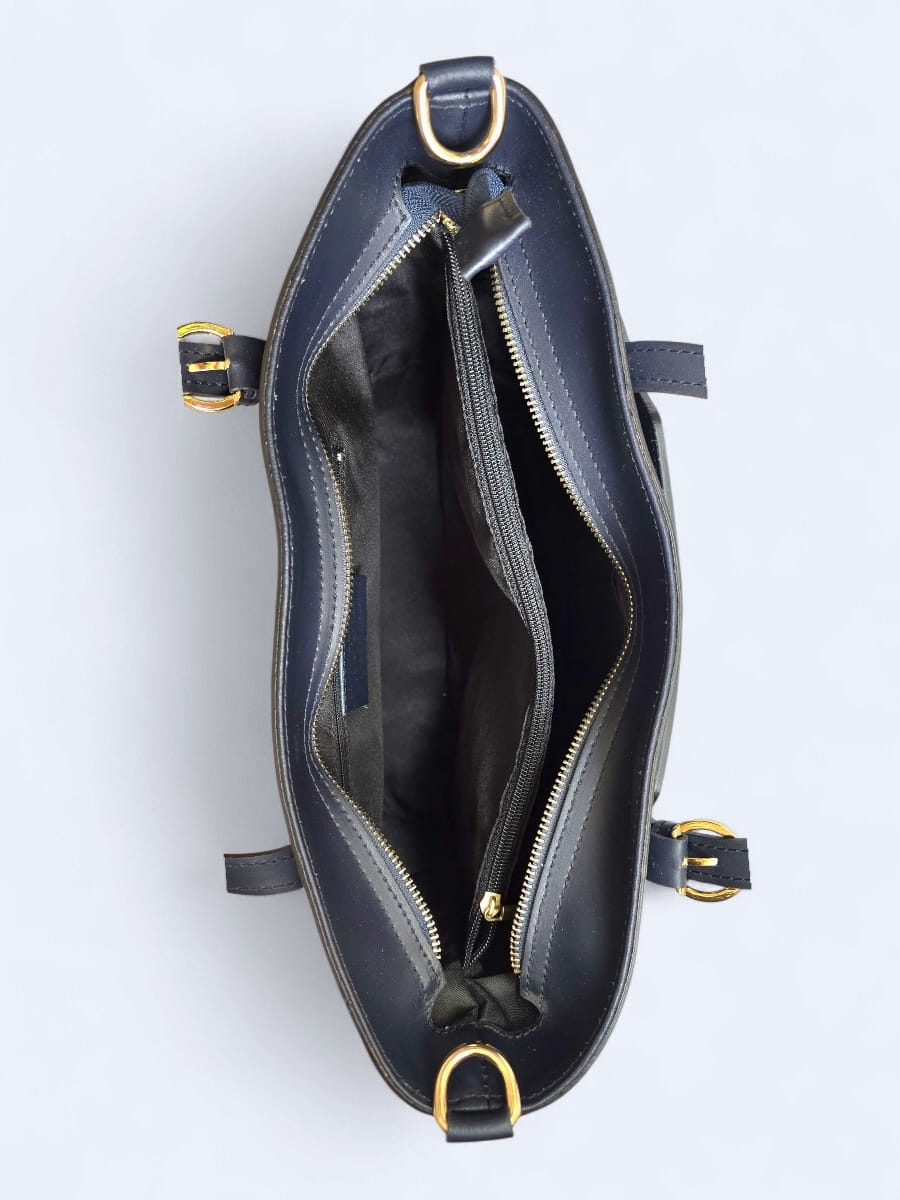 Wewnątrz znajduje się starannie wykończona podszewka, a dwie główne komory pozwalają na wygodne uporządkowanie zawartości. Dodatkowo, torba posiada cztery praktyczne kieszonki – dwie z nich są zapinane na zamek, co umożliwia bezpieczne przechowywanie drobiazgów i cennych przedmiotów.