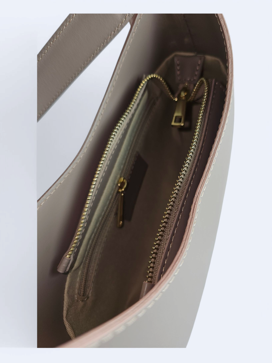 Posiada solidny skórzany pasek, by nosić torbę wygodnie na ramieniu. Środek wykończony podszewką. Zamykana na zamek.