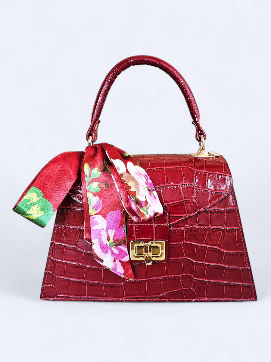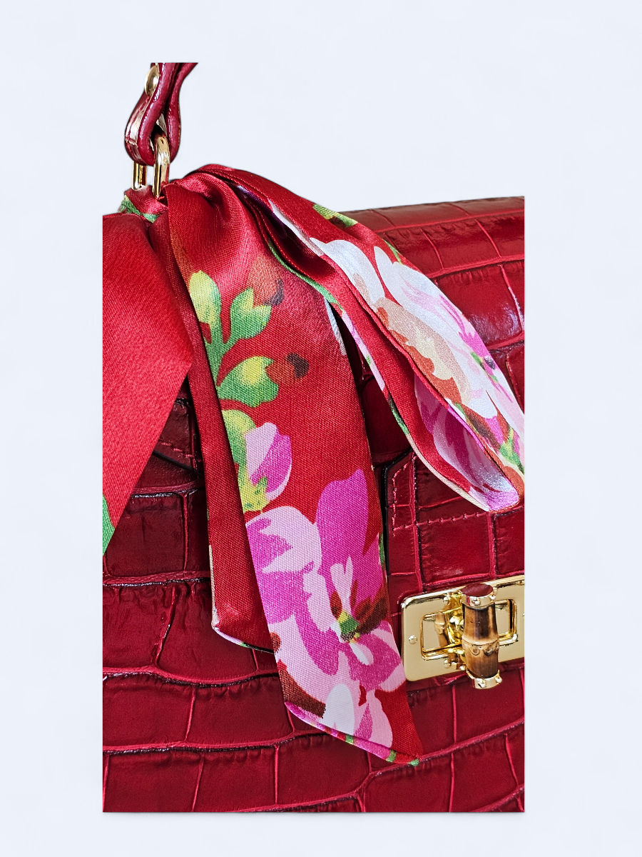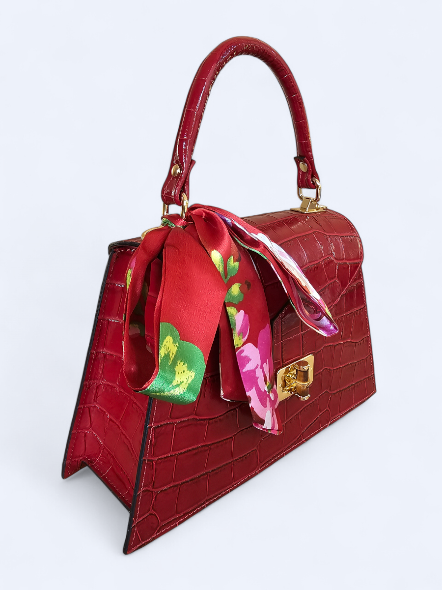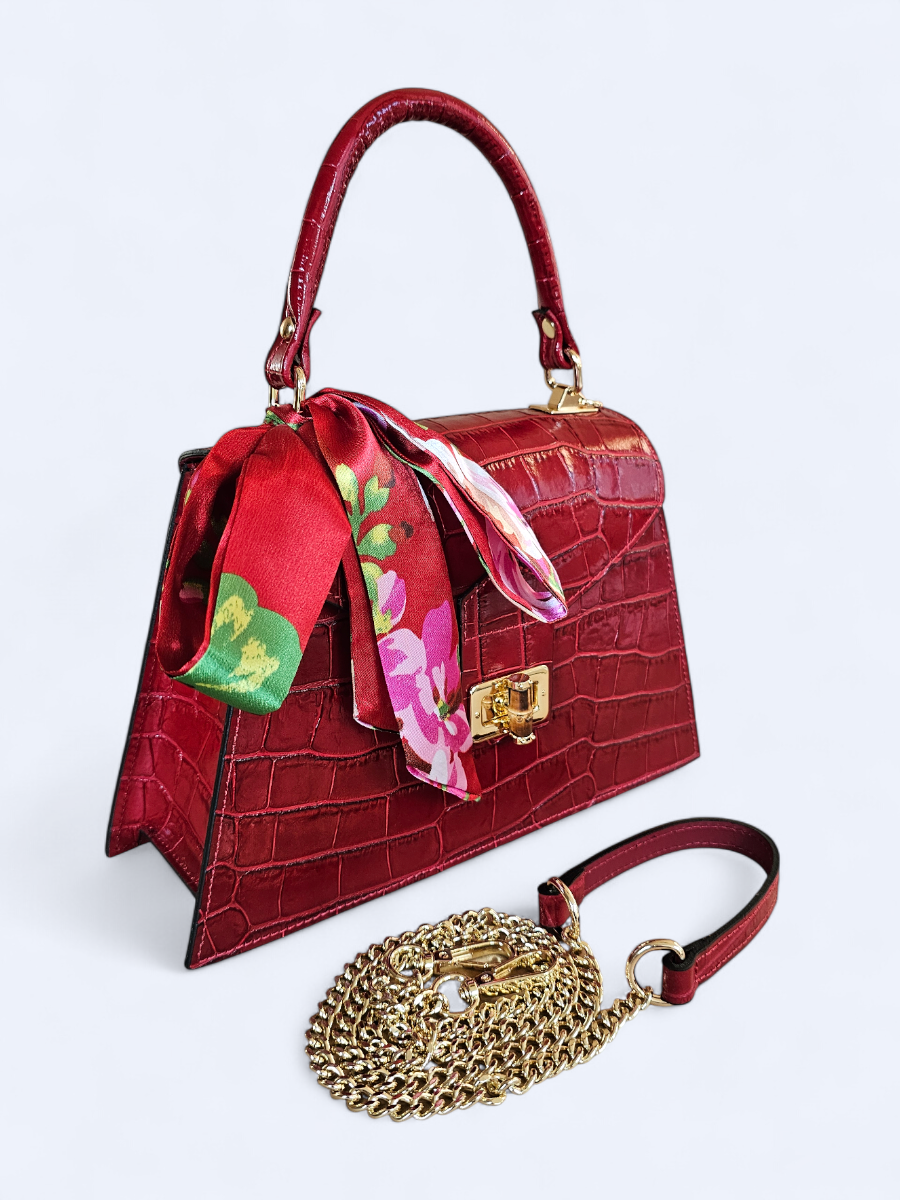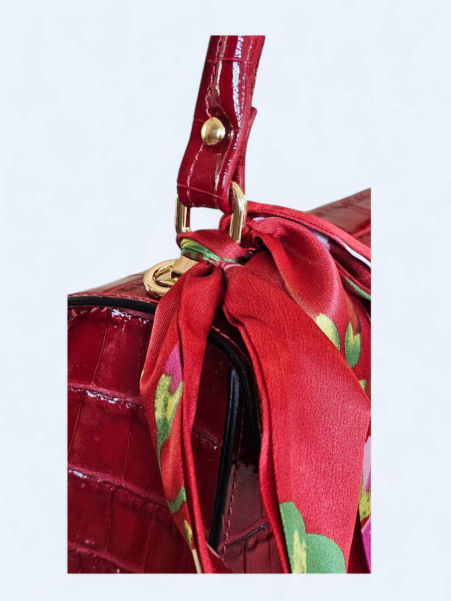 Możliwość noszenia zarówno w ręku, jak i na pasku sprawia, że kuferek doskonale sprawdzi się w różnych sytuacjach – od codziennych wyjść po eleganckie okazje. Dodatkowym atutem jest stylowa apaszka, która subtelnie podkreśla charakter torebki.