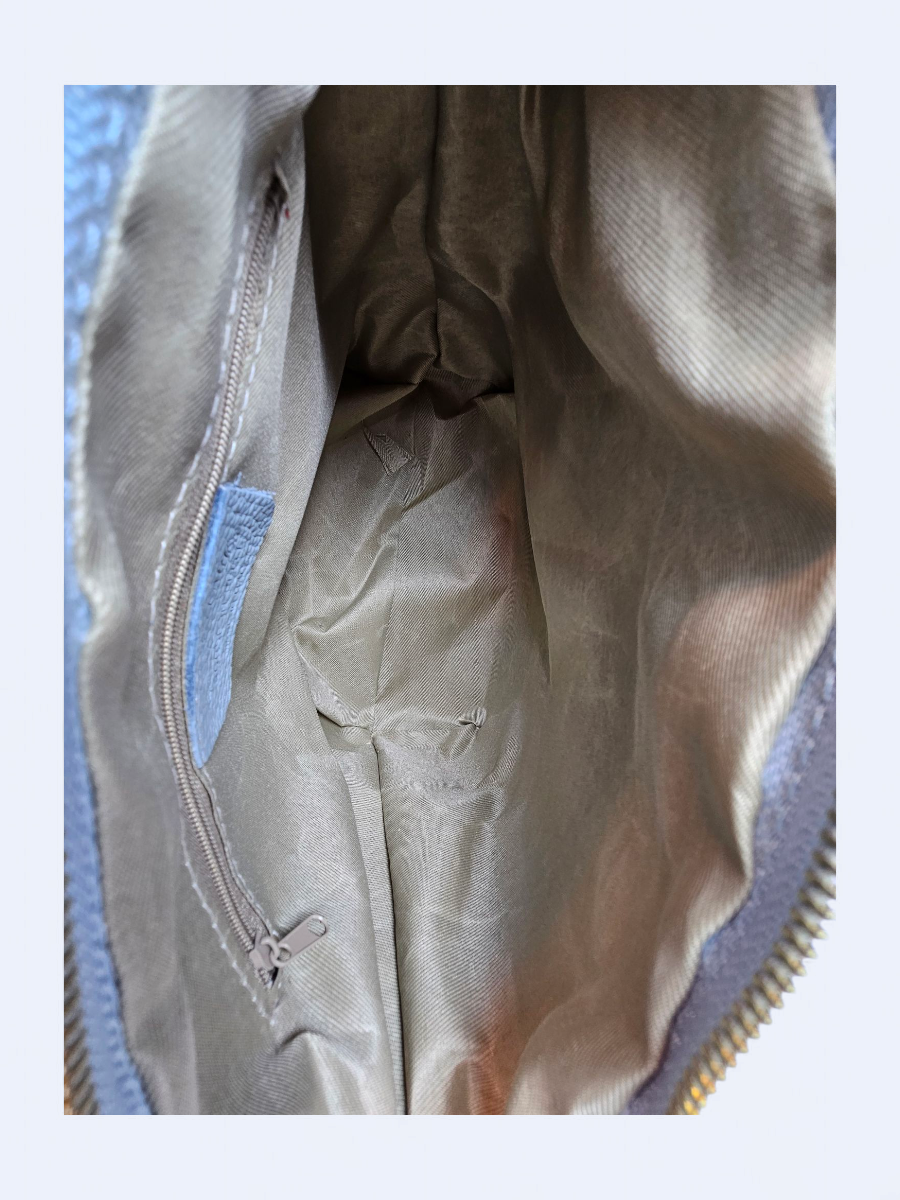 Torebka zamykana jest na zamek, a wnętrze wykończone solidną podszewką. W środku znajduje się praktyczna kieszeń zapinana na suwak – idealna na cenne drobiazgi. Po bokach torebki umieszczono ozdobne zamki, które nadają całości wyjątkowego charakteru.
