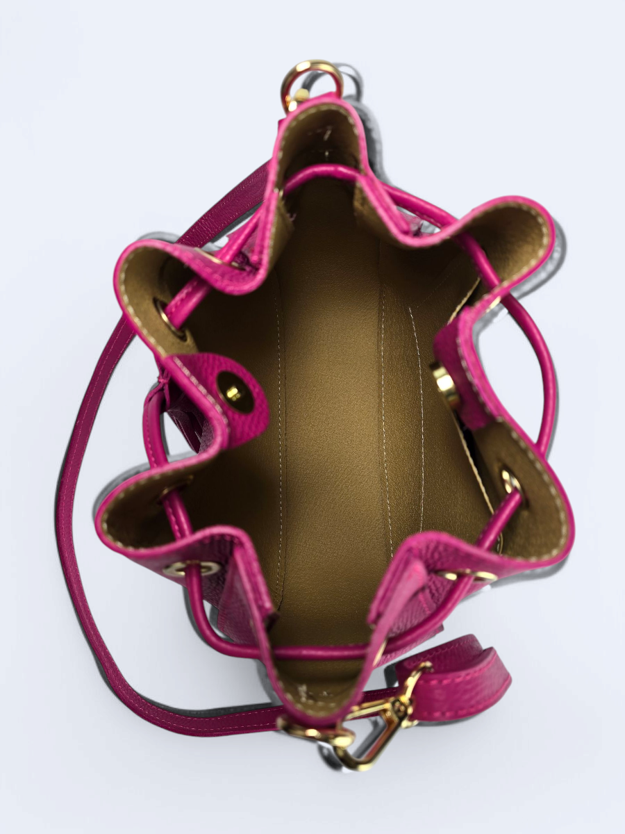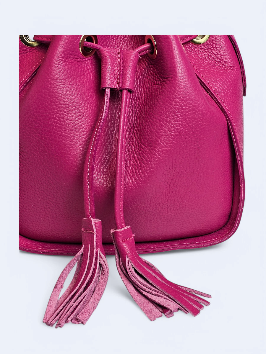 We wnętrzu torebki znajduje się mała kieszonka na drobiazgi, idealna do przechowywania kluczy, telefonu czy innych niezbędnych akcesoriów. Dodatkowe zabezpieczenie zapewnia zamek na nap, a całość dopełnia skórzany sznurek z frędzlami, którym torebka jest dodatkowo ściągana, podkreślając jej charakterystyczny design. Taki model łączy funkcjonalność z unikalnym stylem, sprawdzając się różnych stylizacjach.